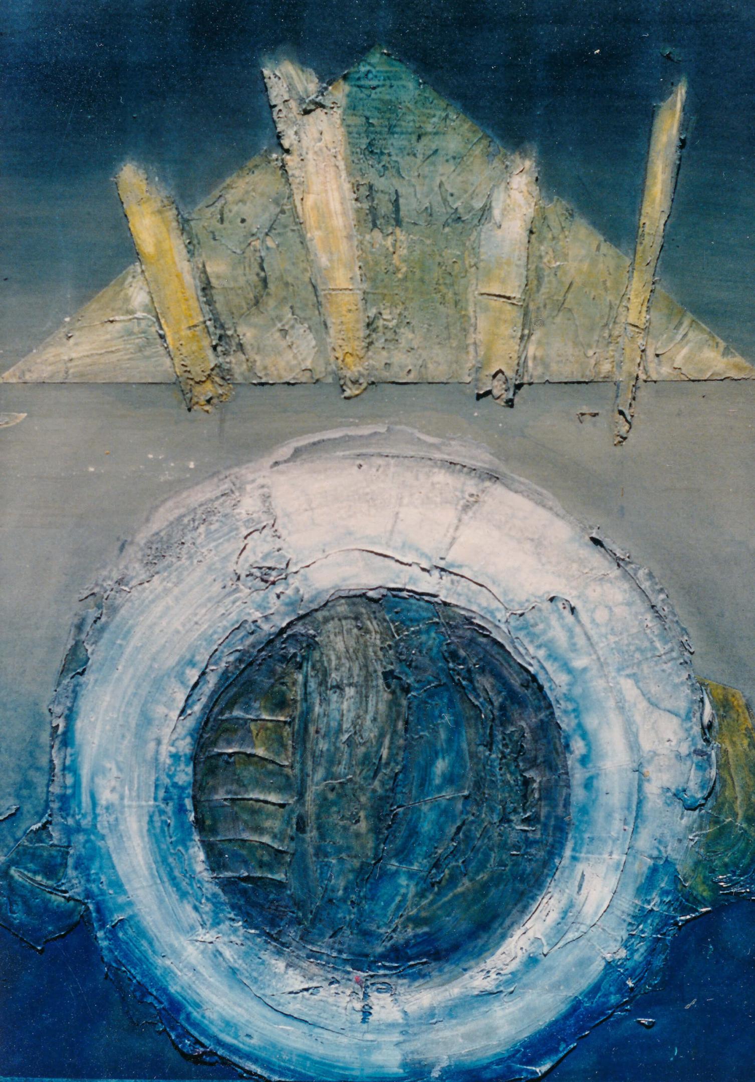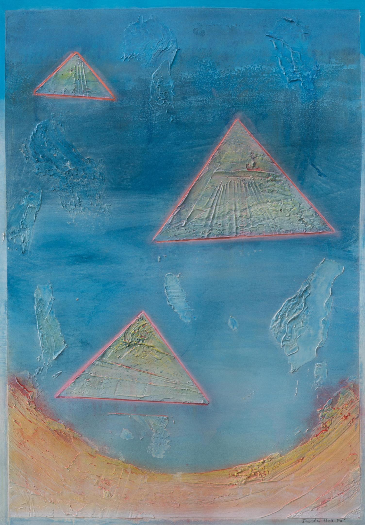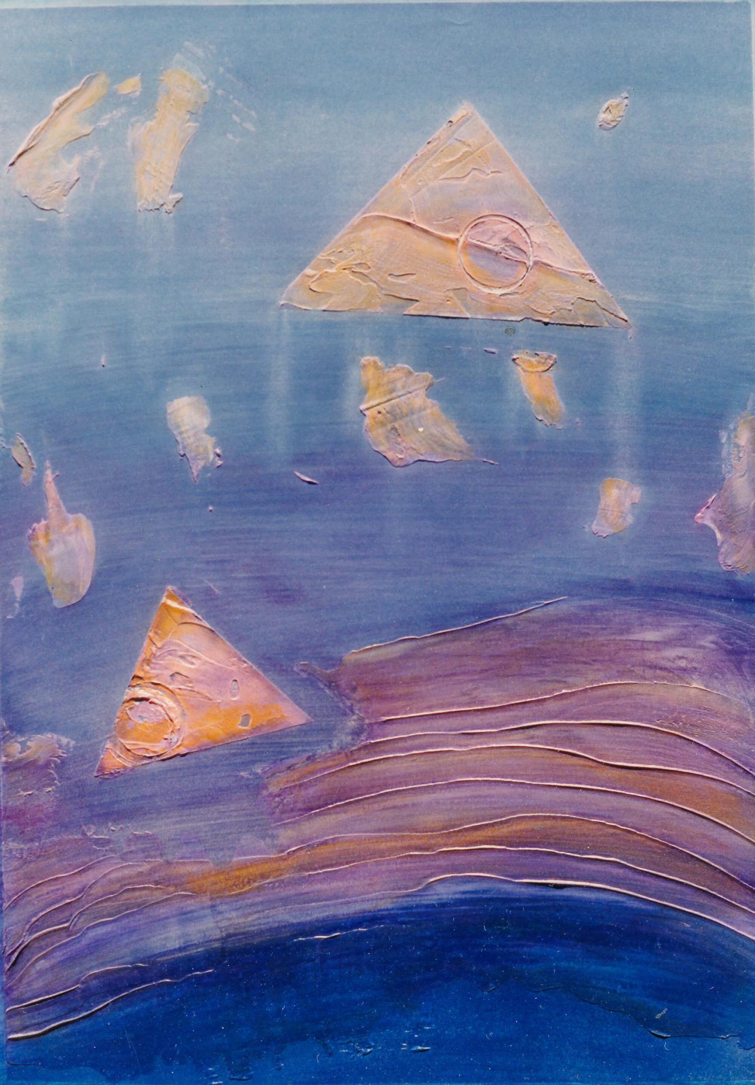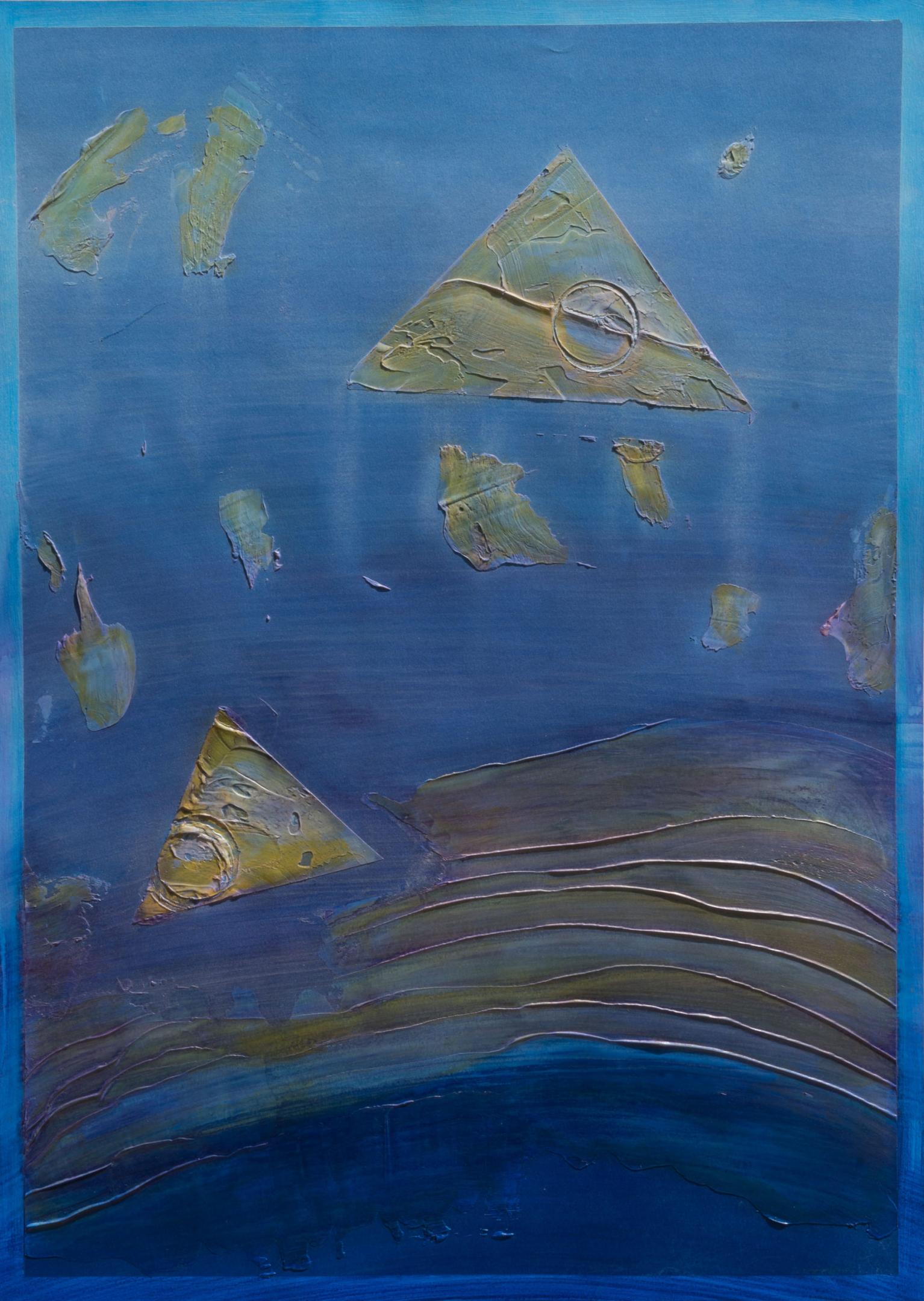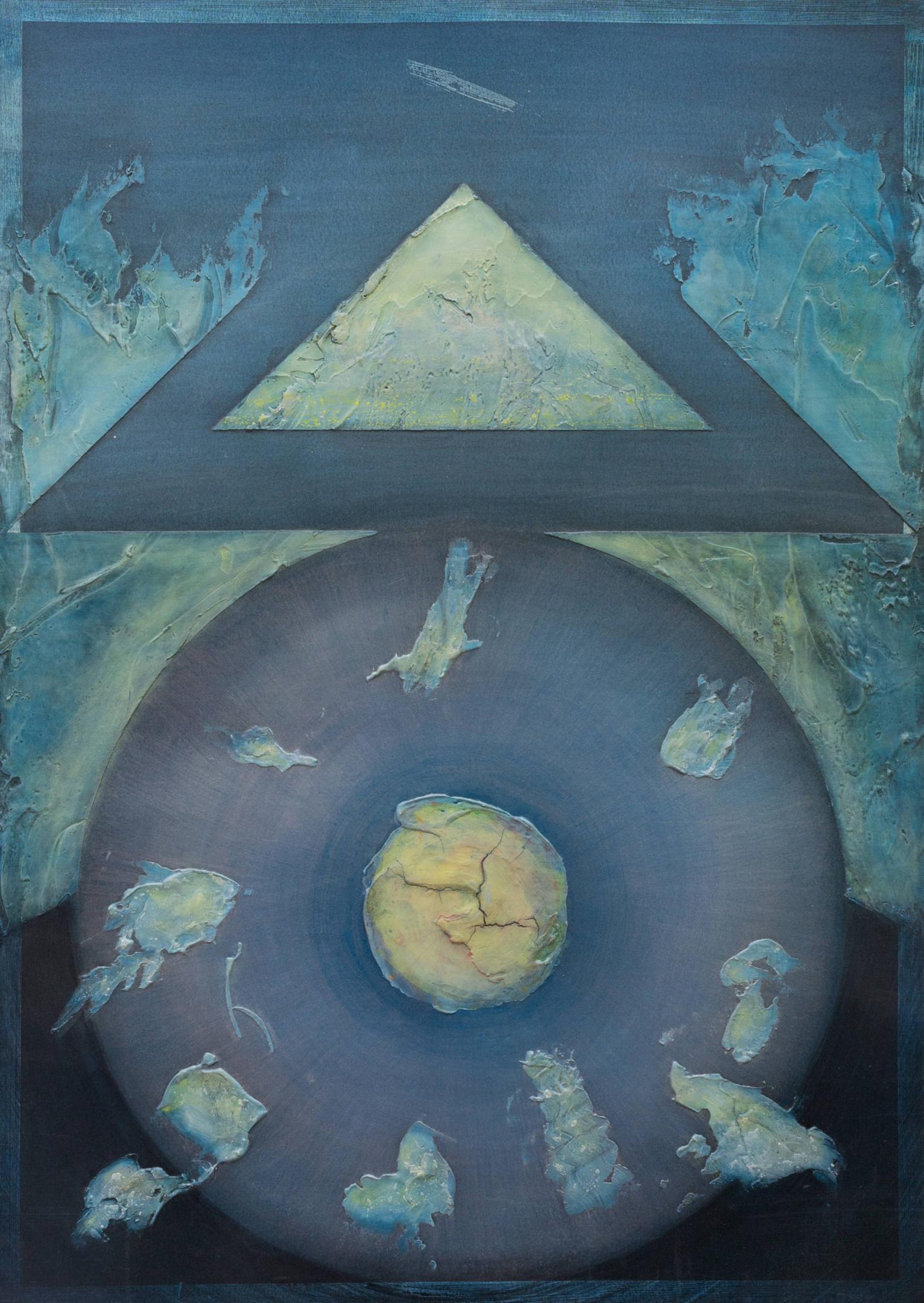 The geometric paintings on paper use modeling paste and acrylic gel to give them their 3-dimensional quality. The pigmentation is gauche water color and pastel.