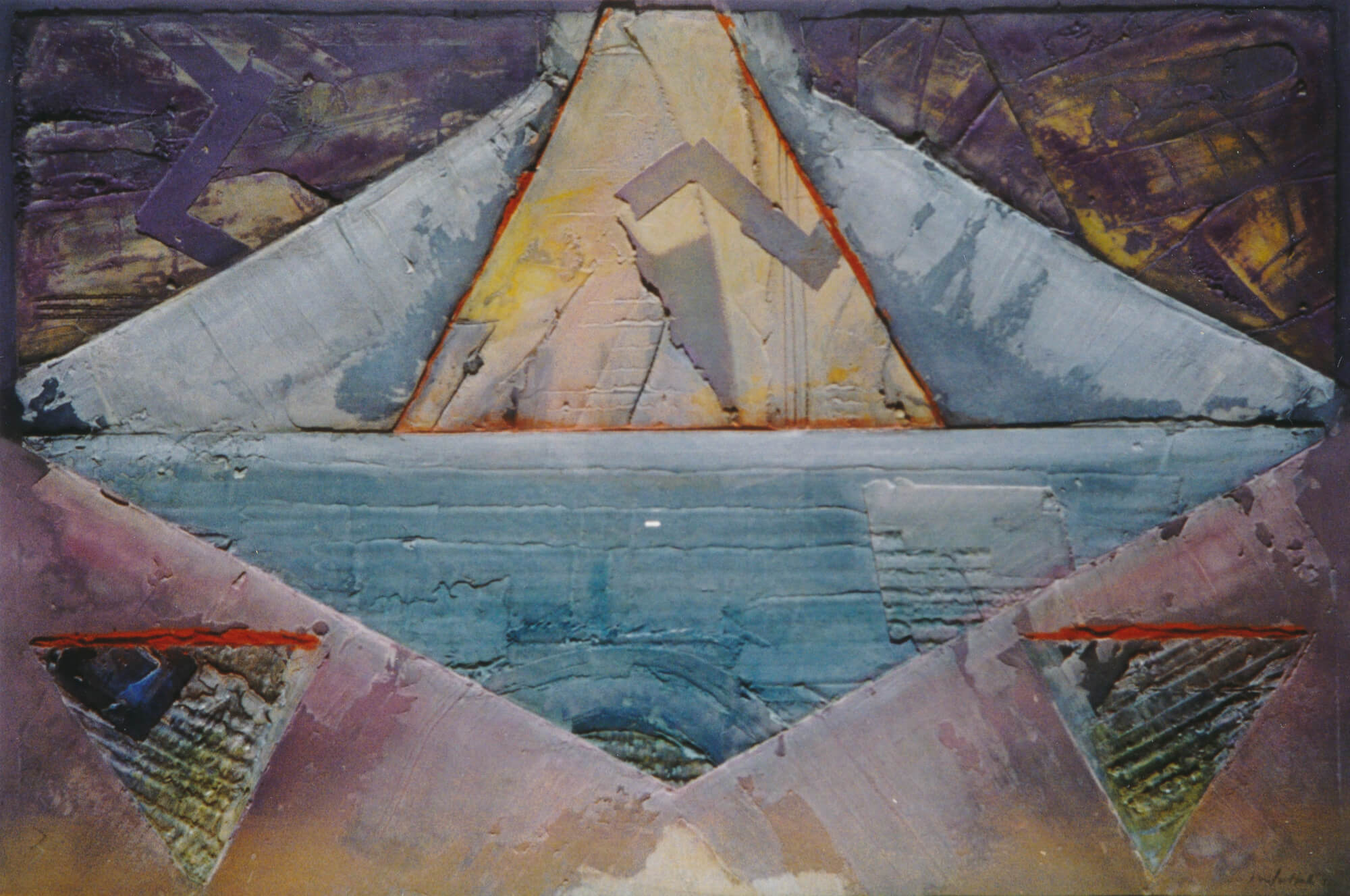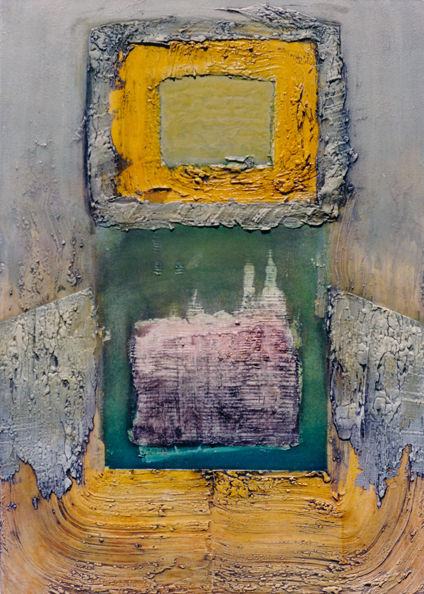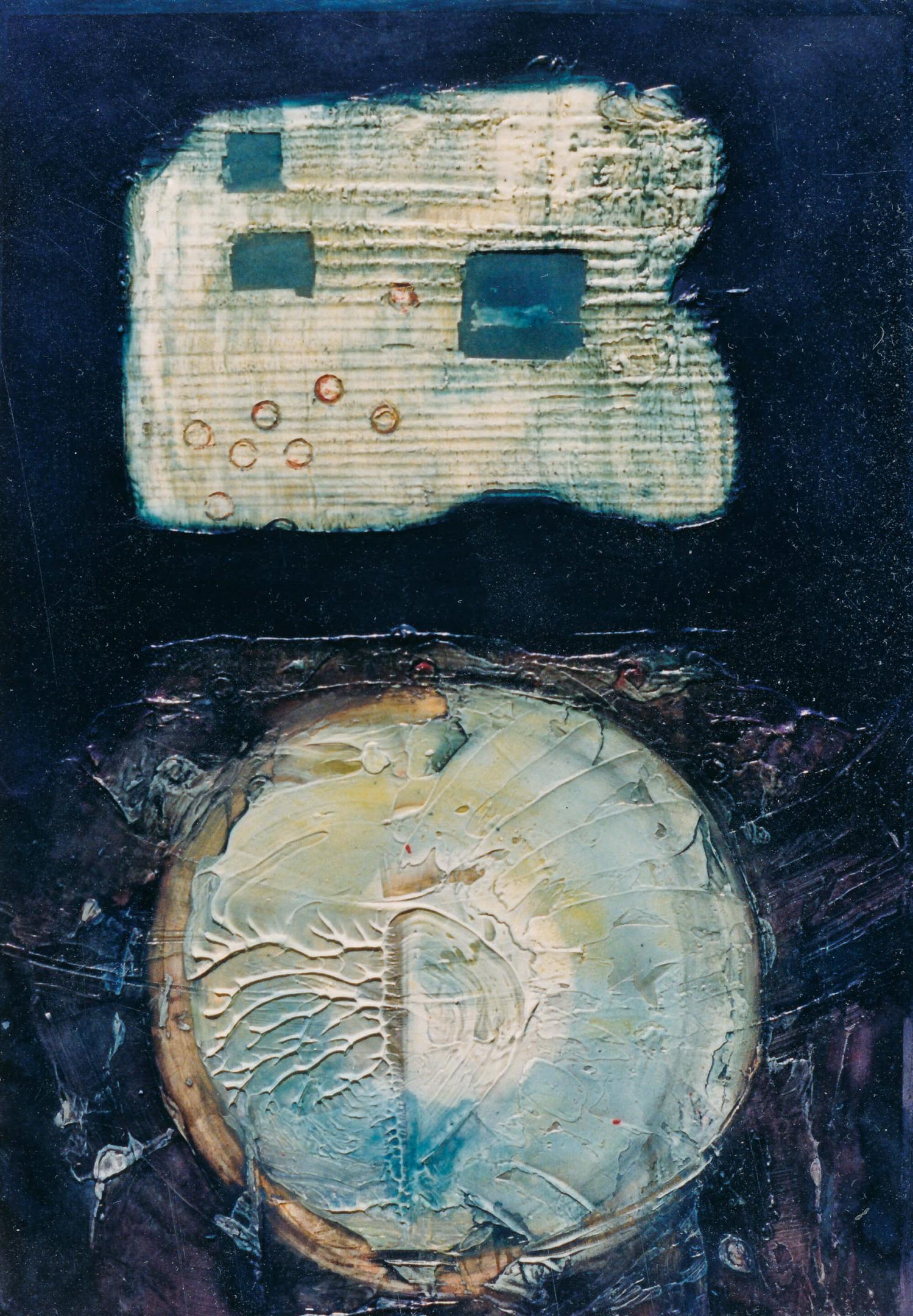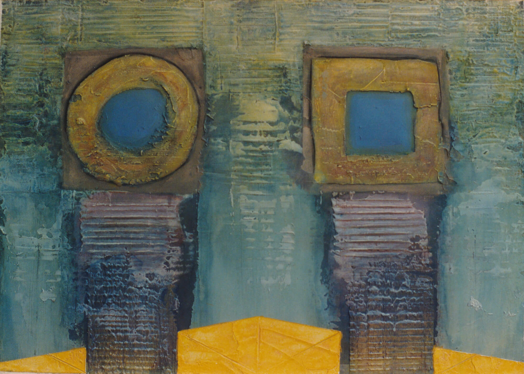 The geometric paintings on paper use modeling paste and acrylic gel to give them their 3-dimensional quality. The pigmentation is gauche water color and pastel.