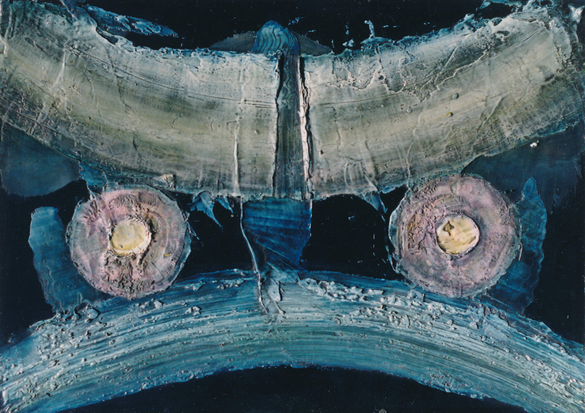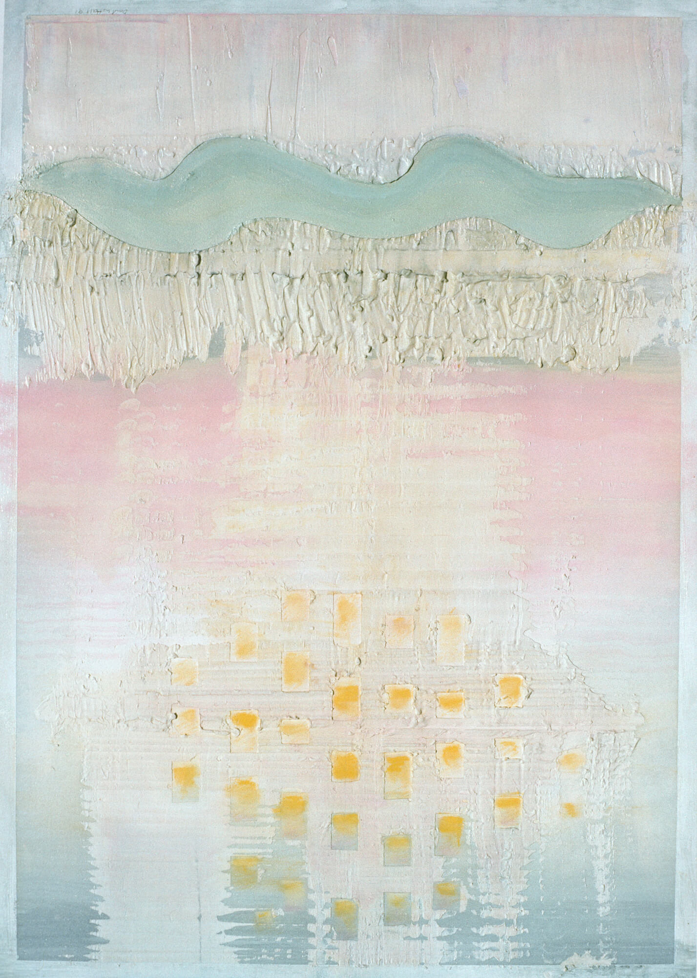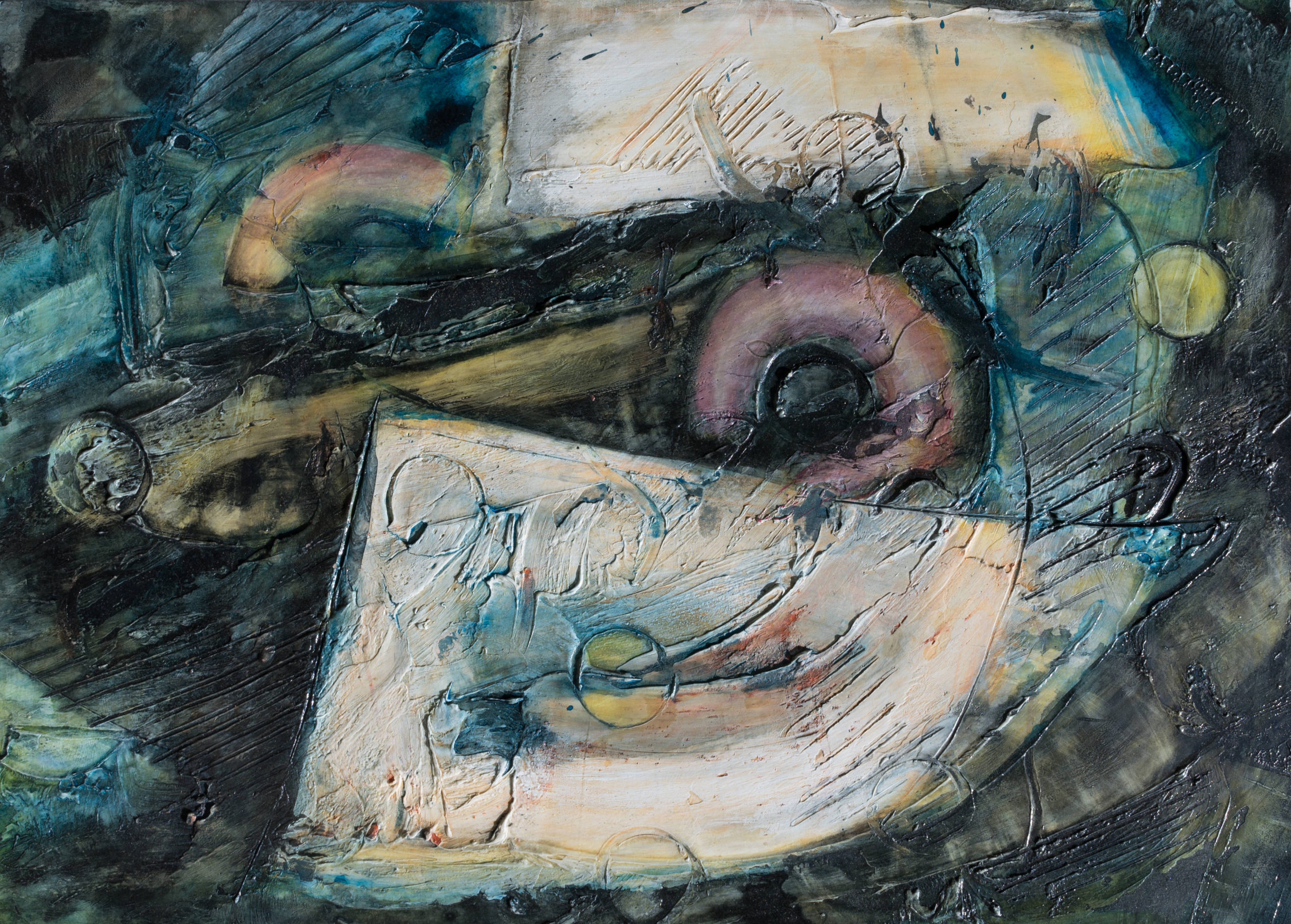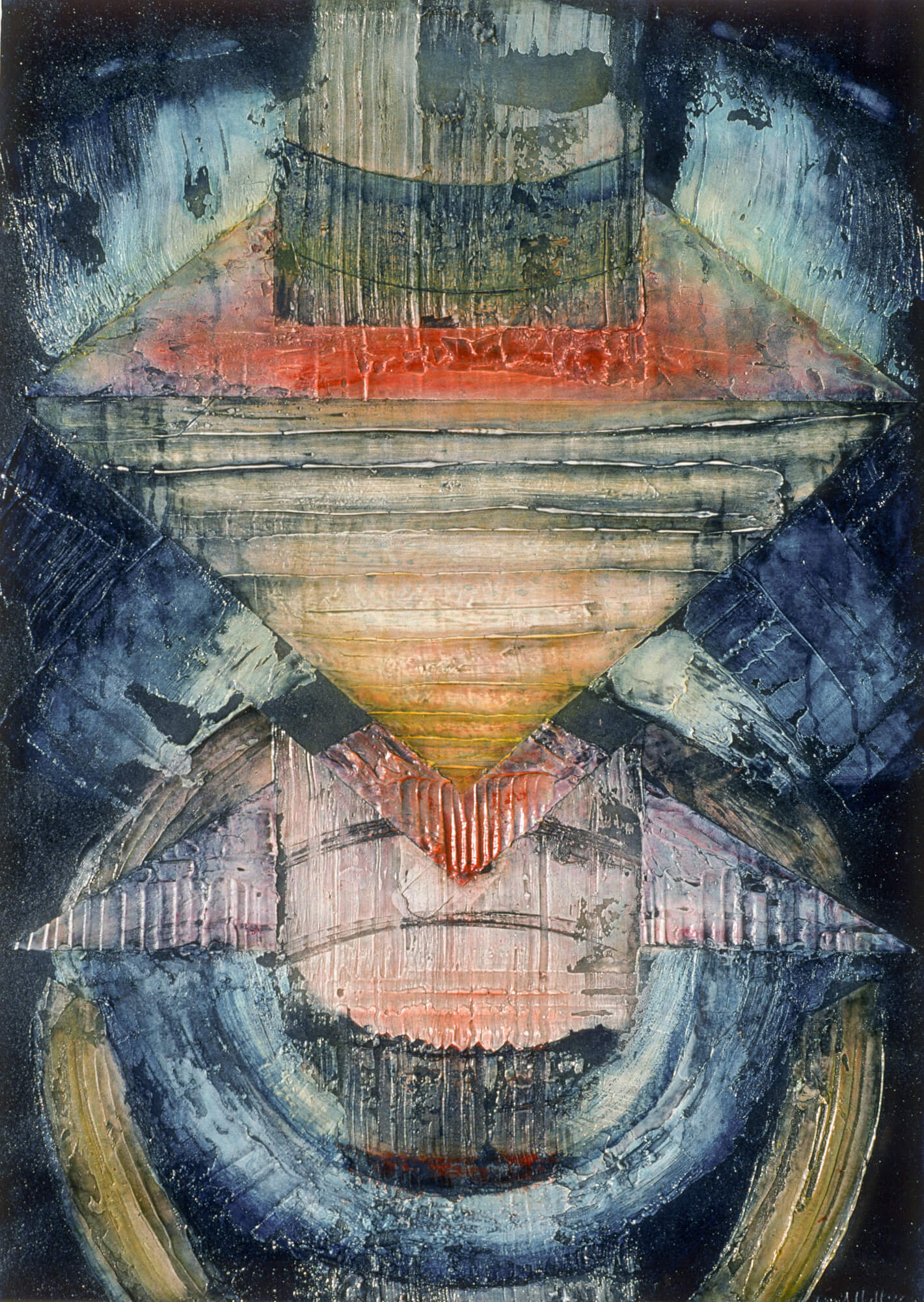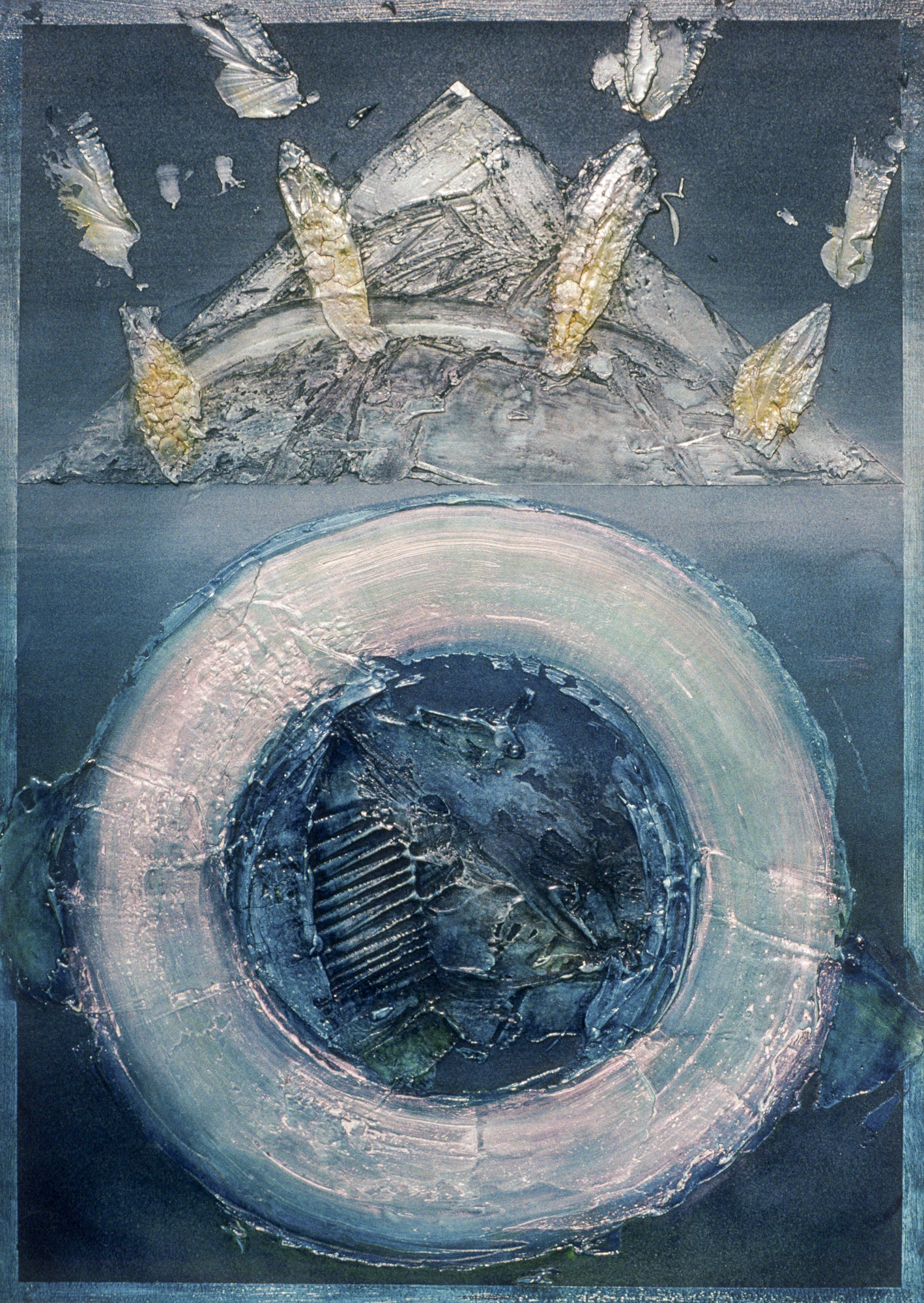 The geometric paintings on paper use modeling paste and acrylic gel to give them their 3-dimensional quality. The pigmentation is gauche water color and pastel.