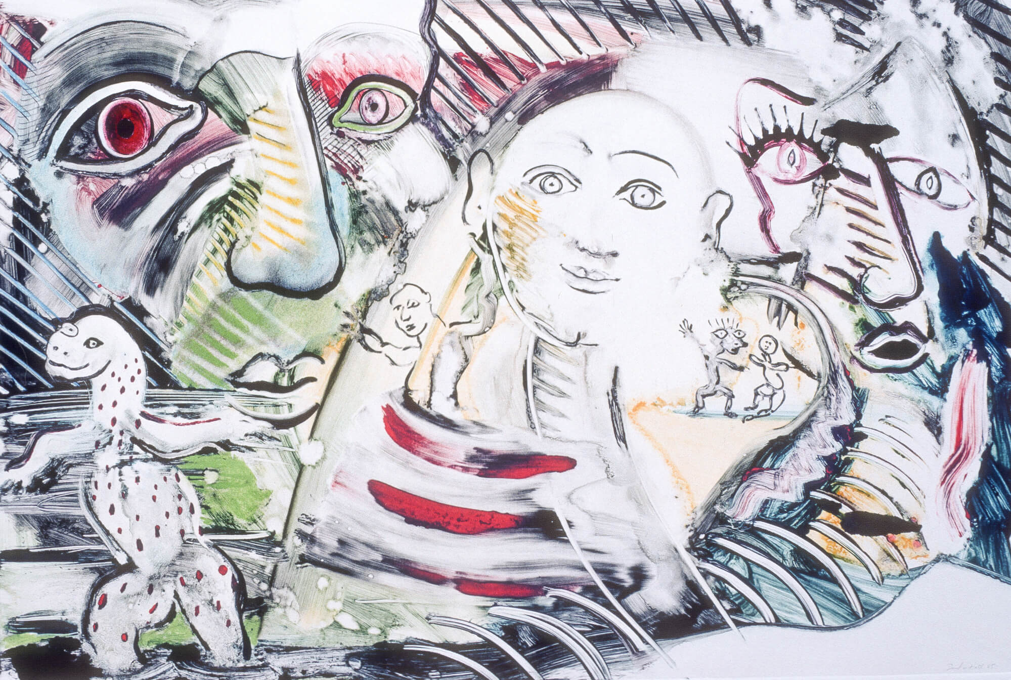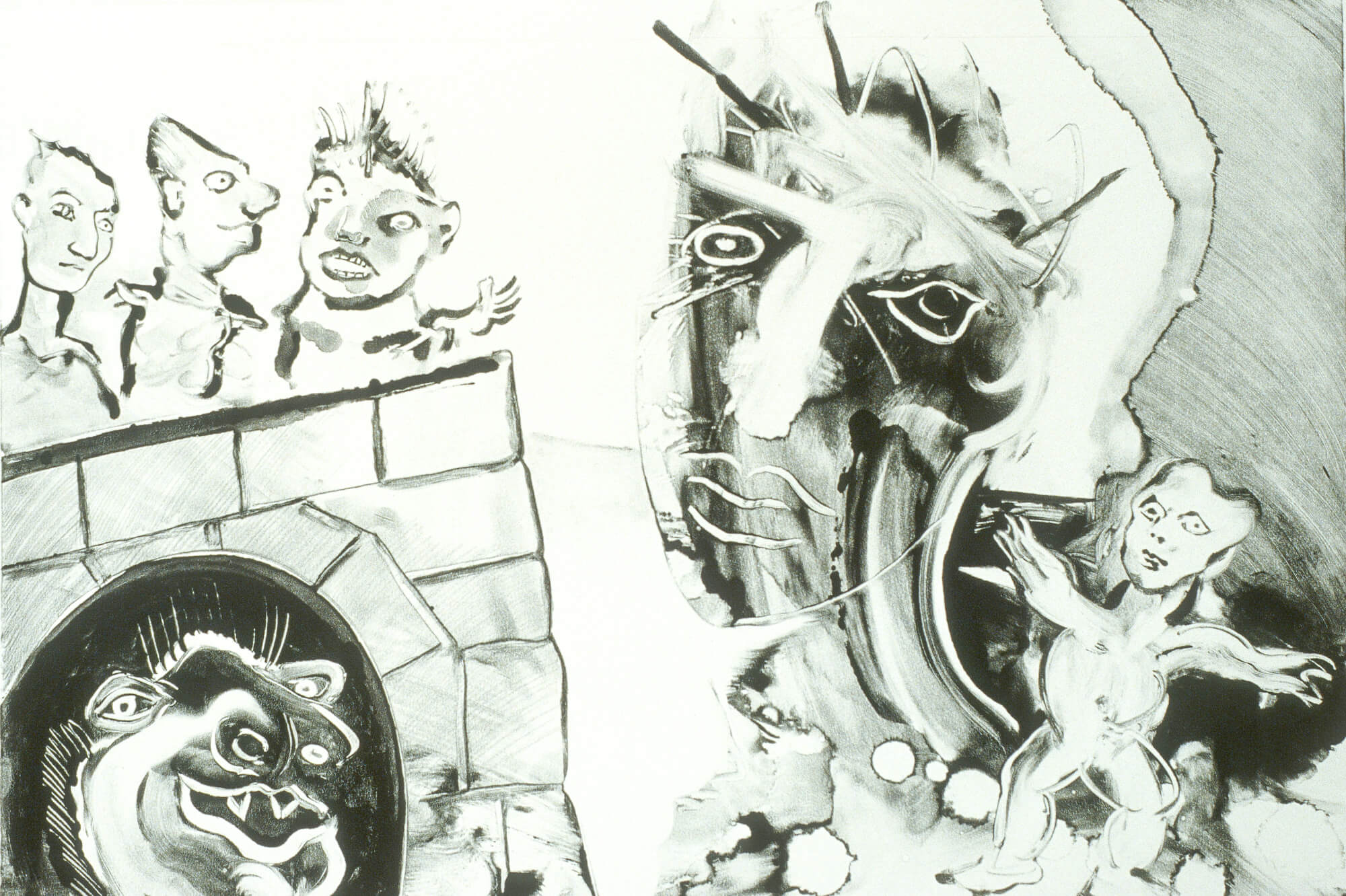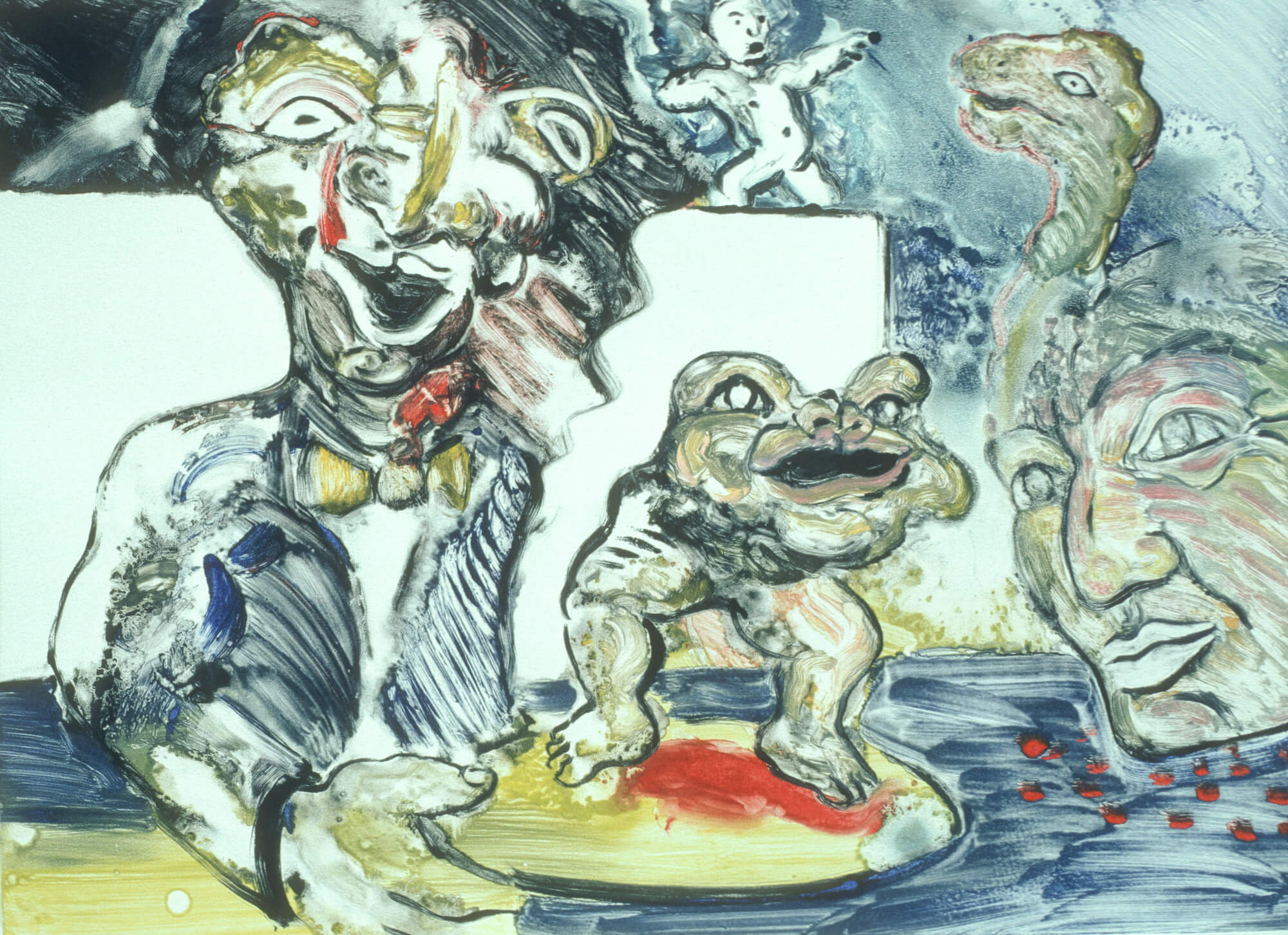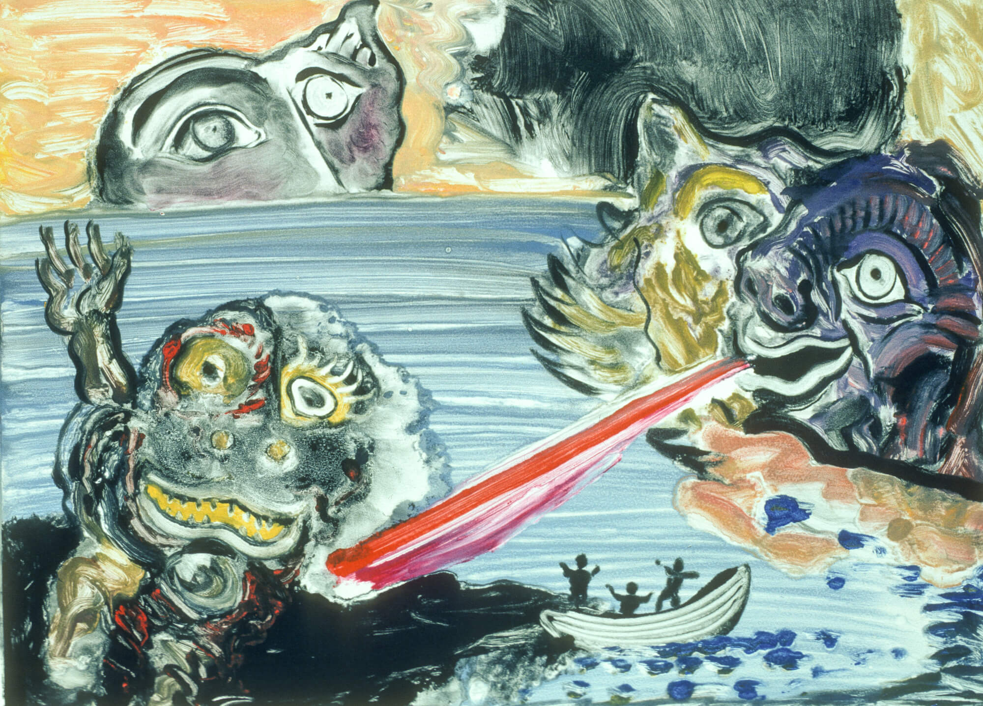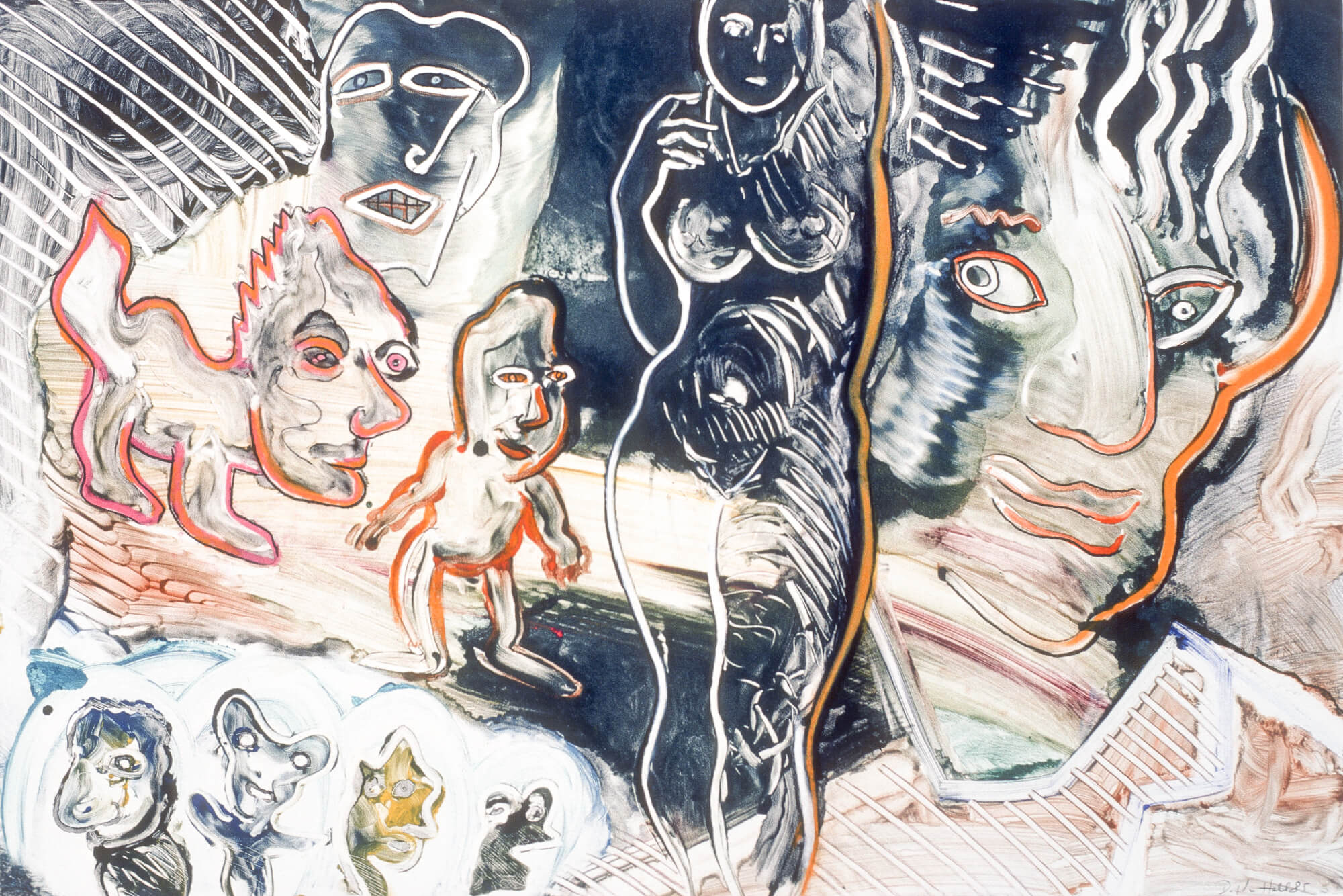 In late 1984 or early 1985, my husband David contracted Murine Thypus from the bite of a flea after he trapped a rat at his art studio. He was deathly ill and it took doctors a LONG time to figure out what he had. His fever burned at 104 for over 2 weeks. It was a very anxiety-inducing time. When he recovered and started to produce art again, I noticed the images literally burst forth from his brain and spilled onto the paper. Using the monotype medium, he could work very quickly, which suited the way his mind was working. So I called the group of work “Split Mind,” because it was as if his mind had split open! I don’t think David likes this category title very much, but that’s what I see. Humor, creatures, myths all mixed together with lots of energy.
