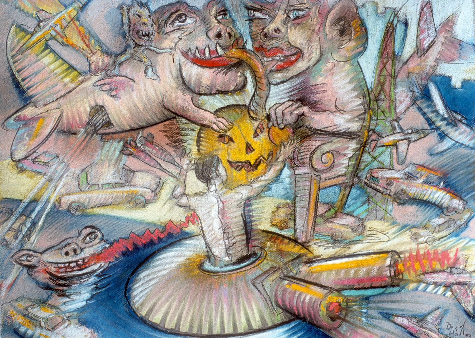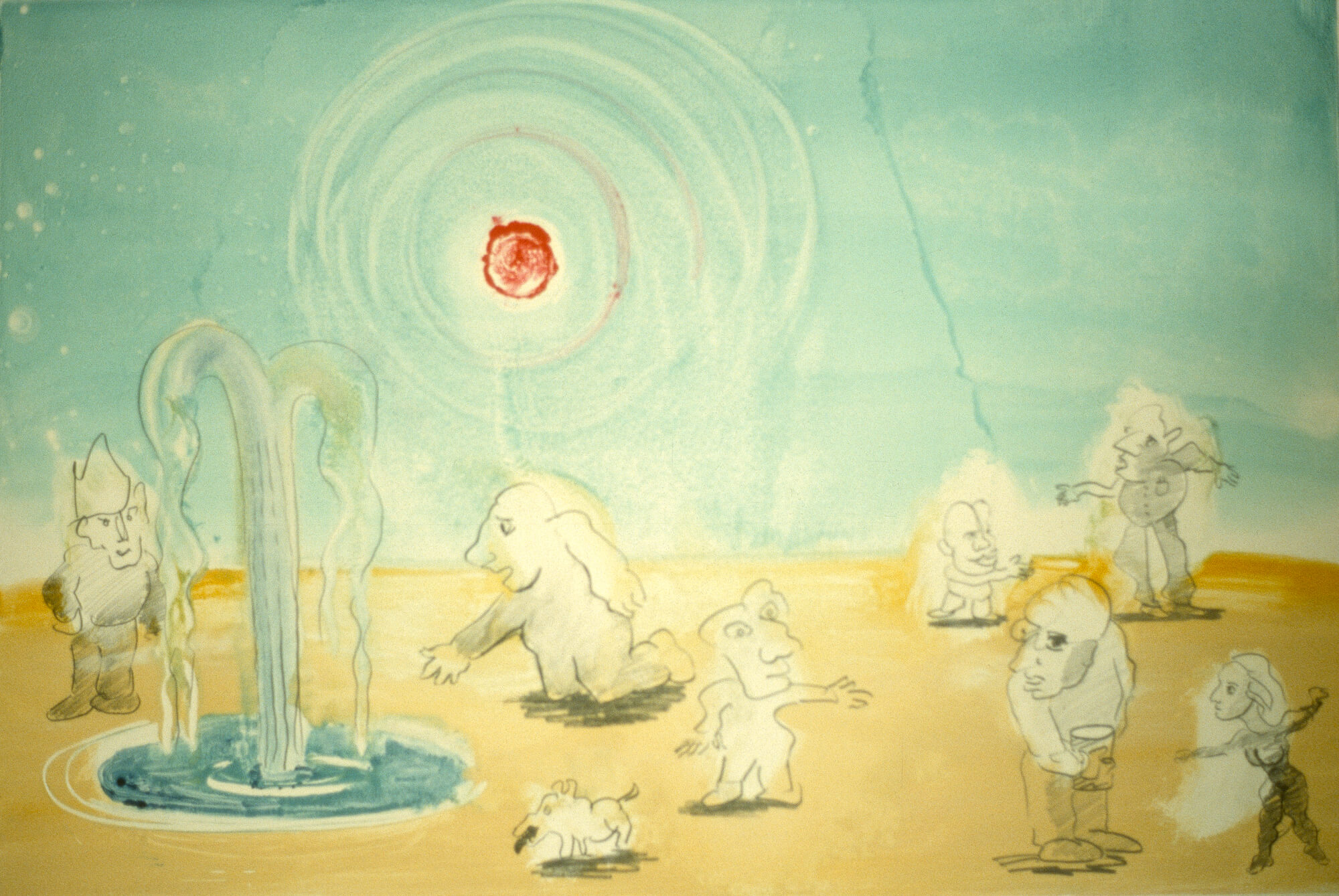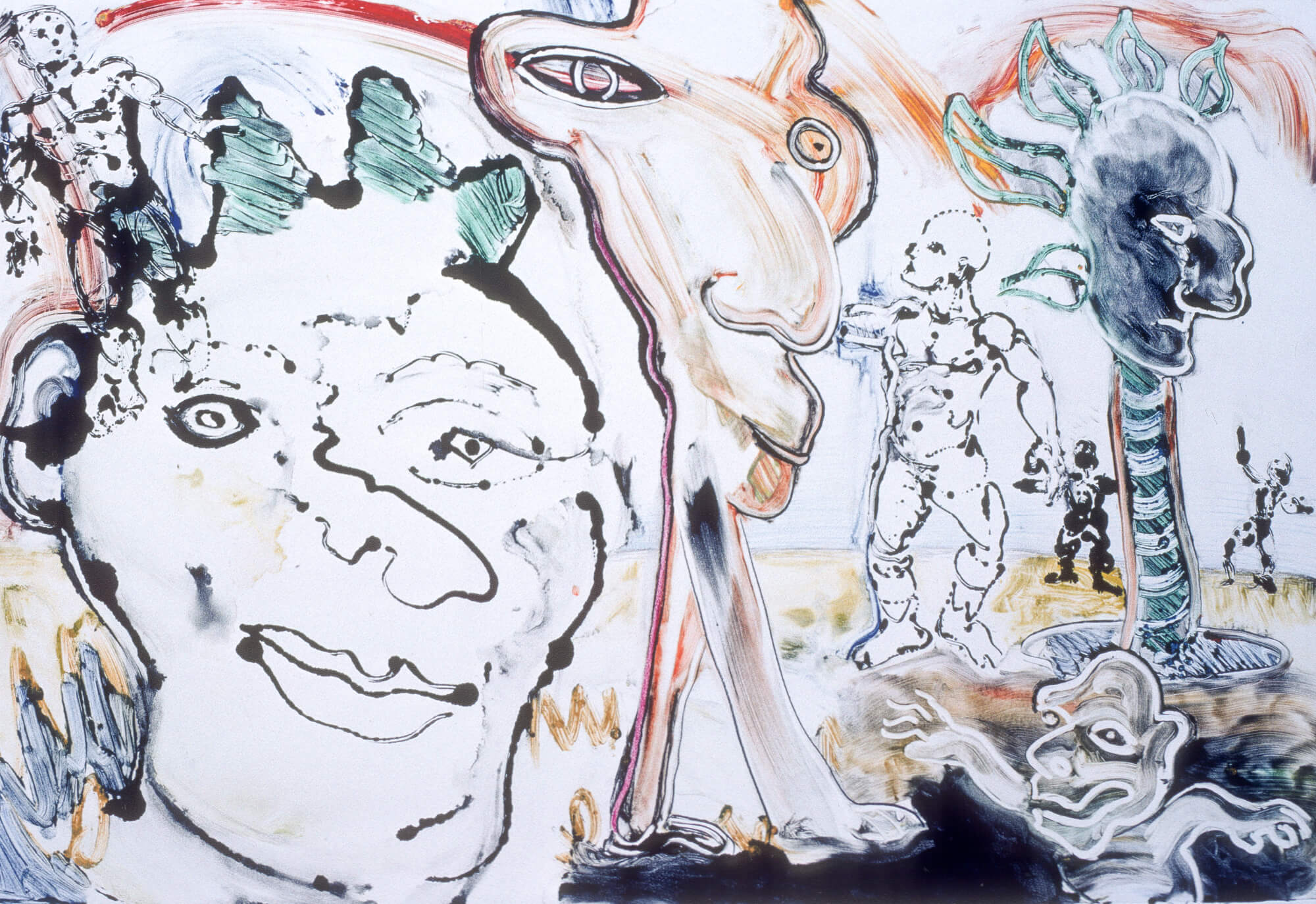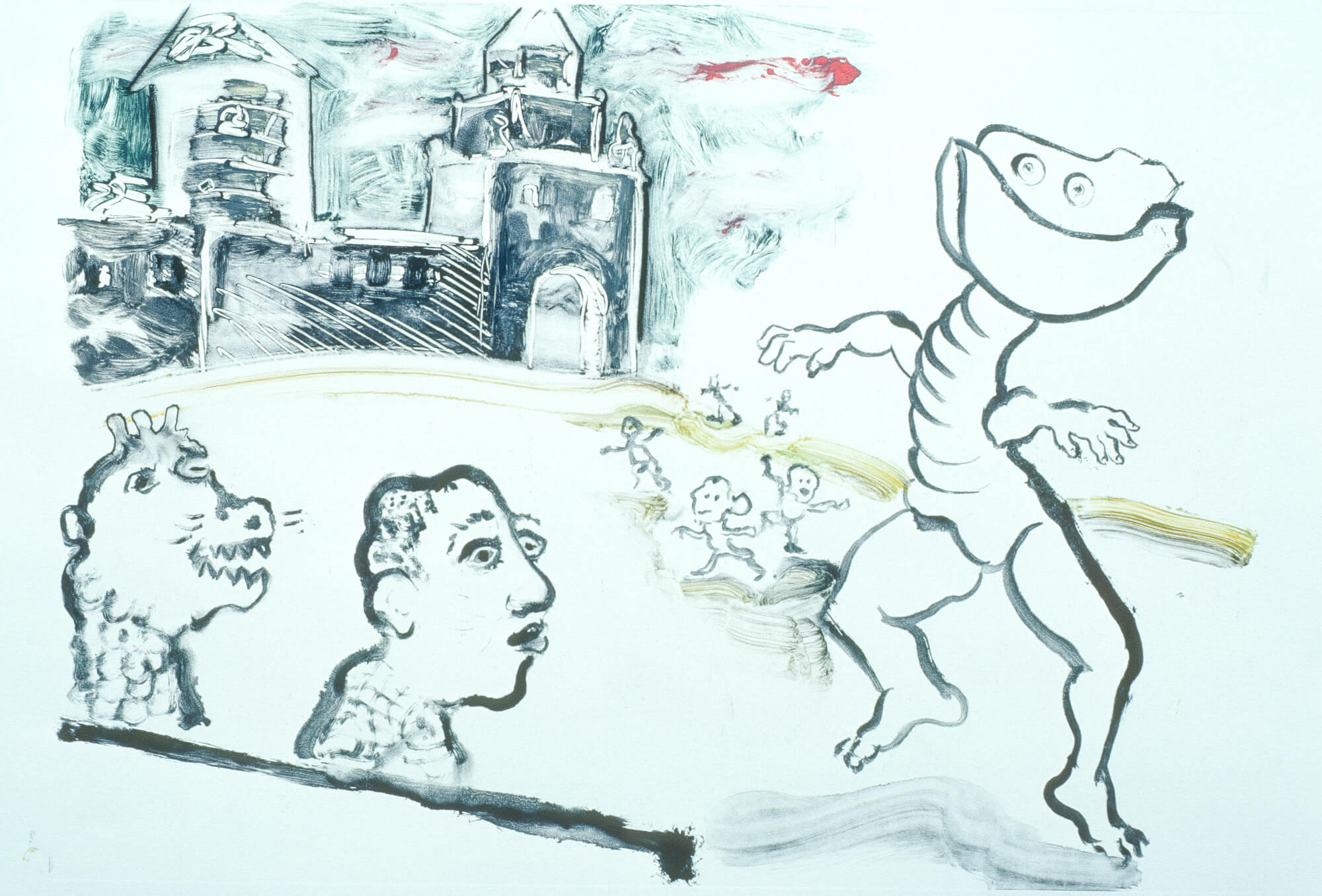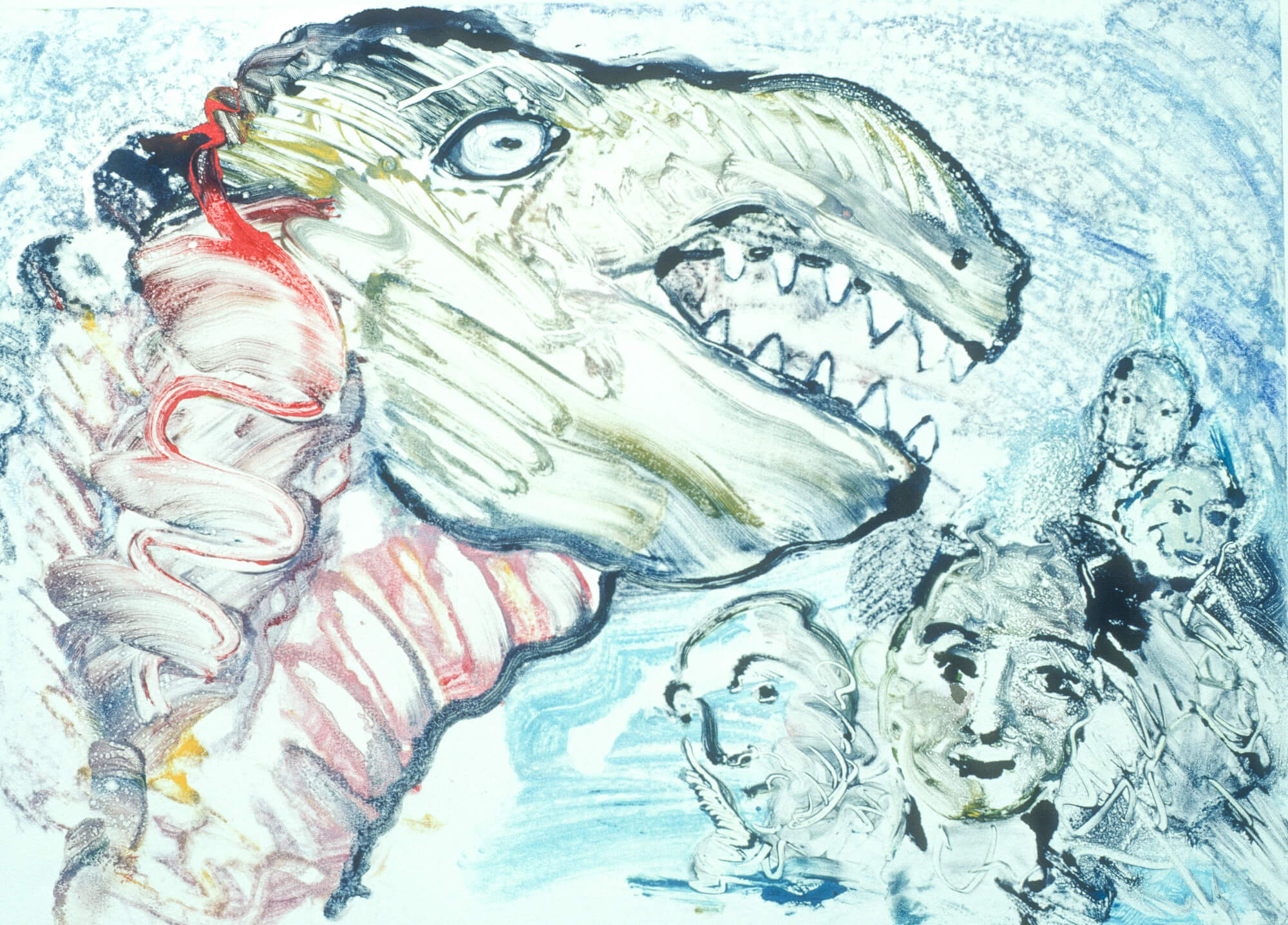 In late 1984 or early 1985, my husband David contracted Murine Thypus from the bite of a flea after he trapped a rat at his art studio. He was deathly ill and it took doctors a LONG time to figure out what he had. His fever burned at 104 for over 2 weeks. It was a very anxiety-inducing time. When he recovered and started to produce art again, I noticed the images literally burst forth from his brain and spilled onto the paper. Using the monotype medium, he could work very quickly, which suited the way his mind was working. So I called the group of work “Split Mind,” because it was as if his mind had split open! I don’t think David likes this category title very much, but that’s what I see. Humor, creatures, myths all mixed together with lots of energy.