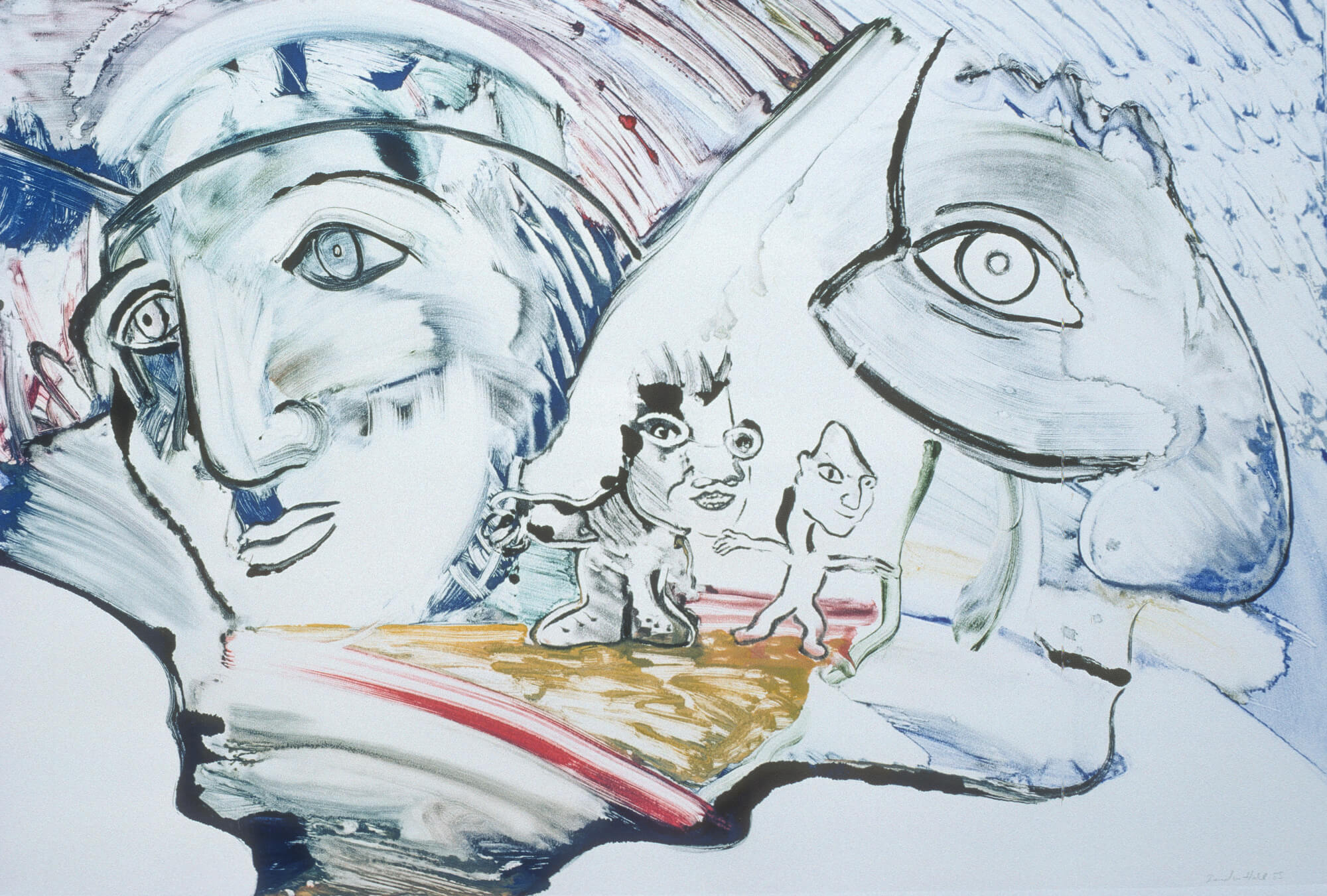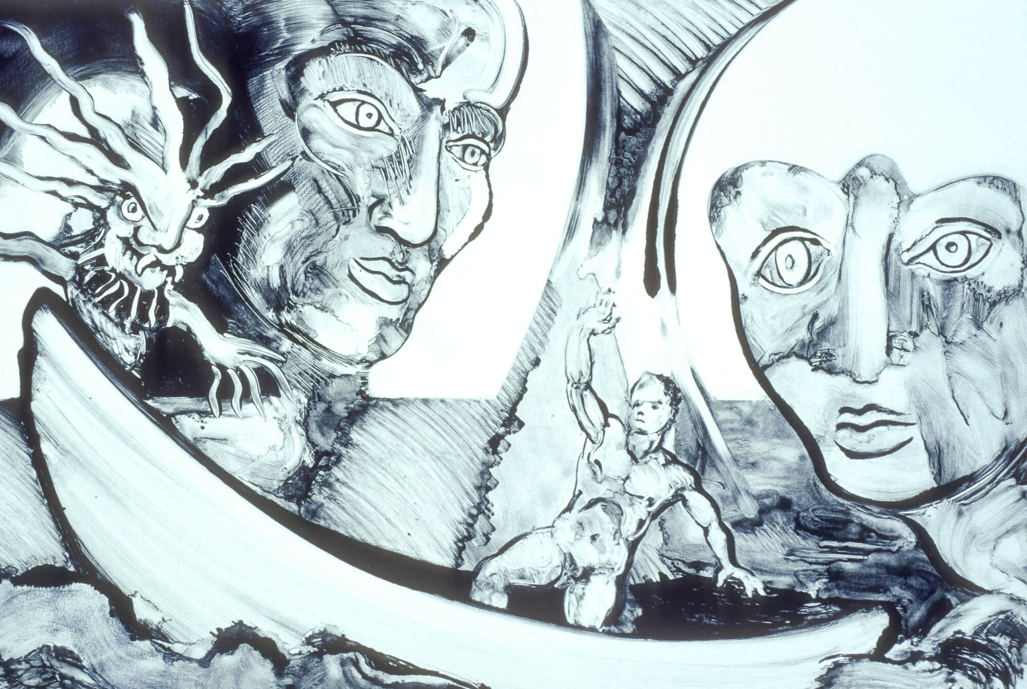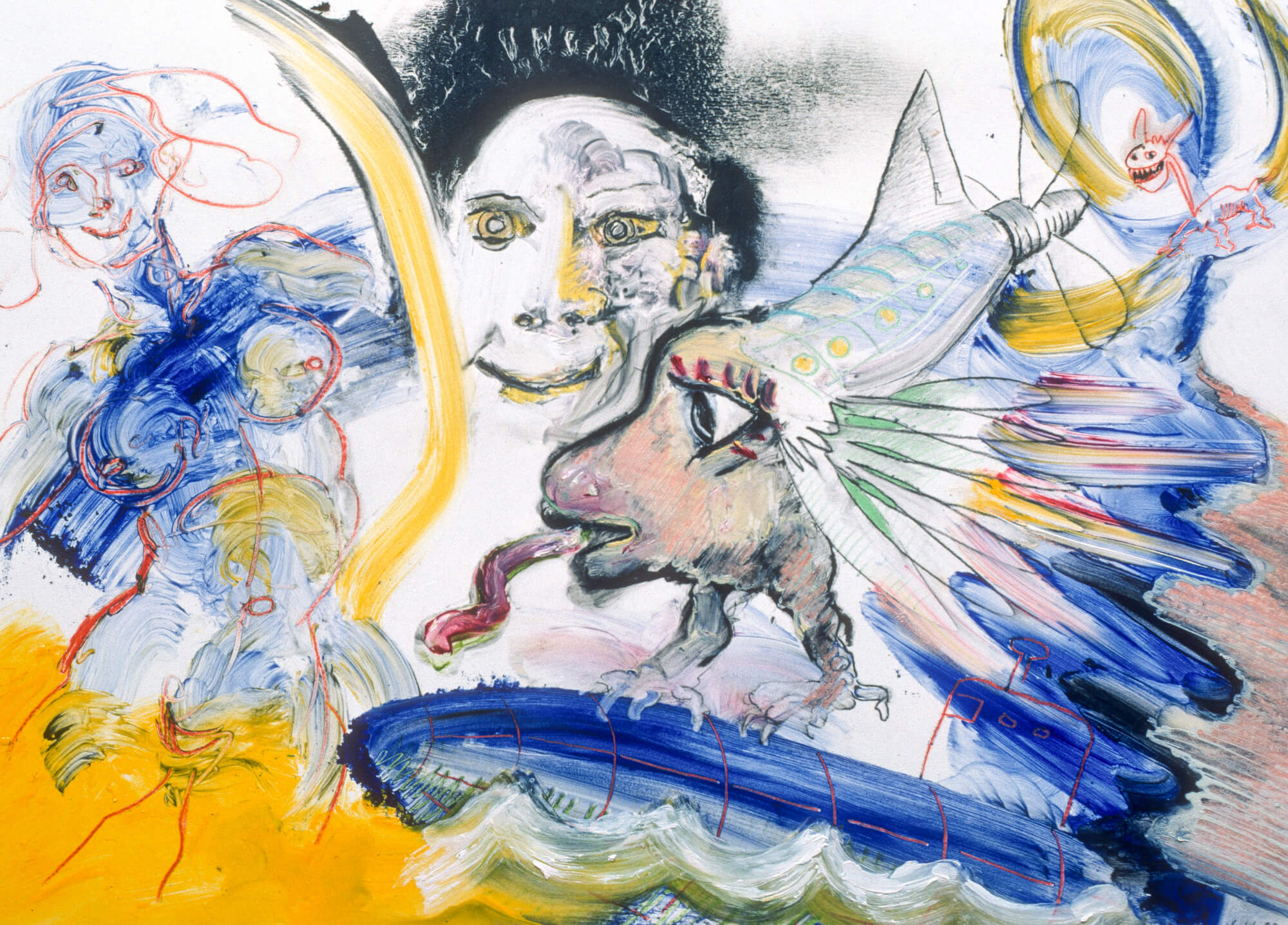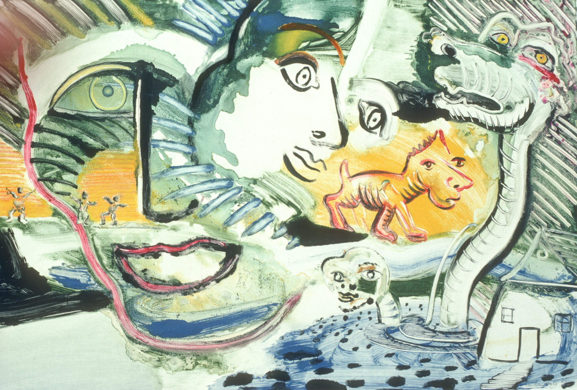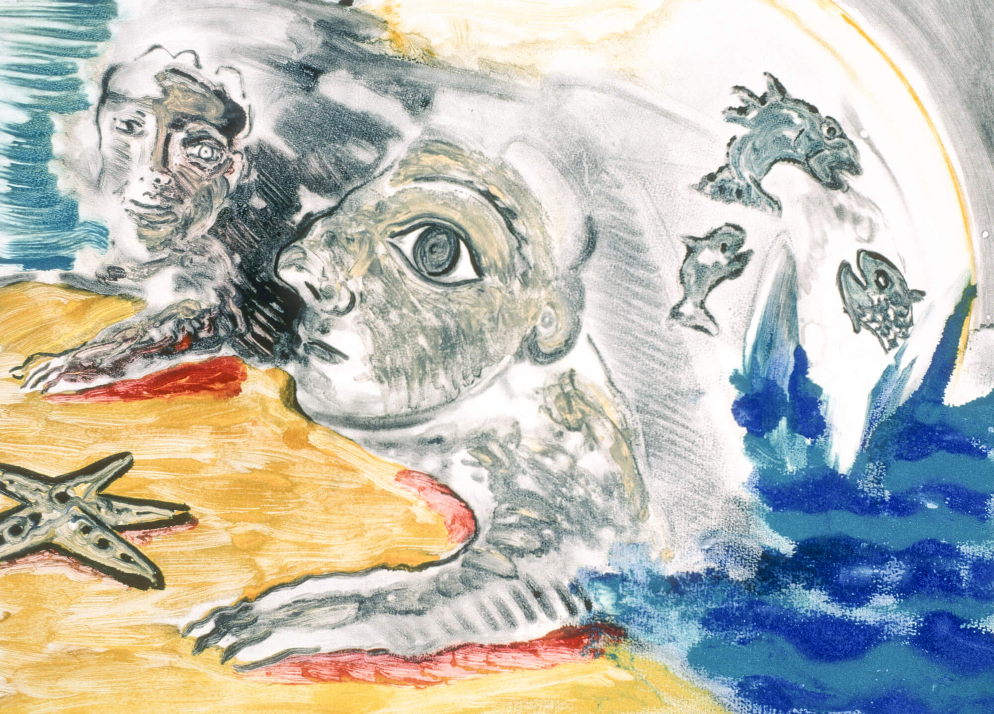In late 1984 or early 1985, my husband David contracted Murine Thypus from the bite of a flea after he trapped a rat at his art studio. He was deathly ill and it took doctors a LONG time to figure out what he had. His fever burned at 104 for over 2 weeks. It was a very anxiety-inducing time. When he recovered and started to produce art again, I noticed the images literally burst forth from his brain and spilled onto the paper. Using the monotype medium, he could work very quickly, which suited the way his mind was working. So I called the group of work “Split Mind,” because it was as if his mind had split open! I don’t think David likes this category title very much, but that’s what I see. Humor, creatures, myths all mixed together with lots of energy.