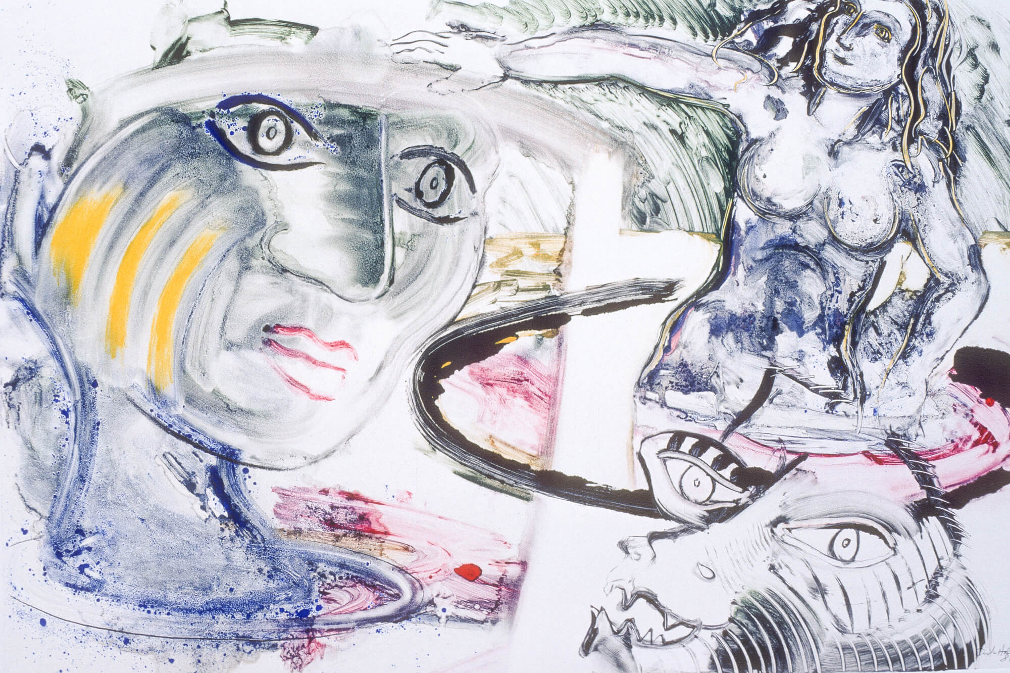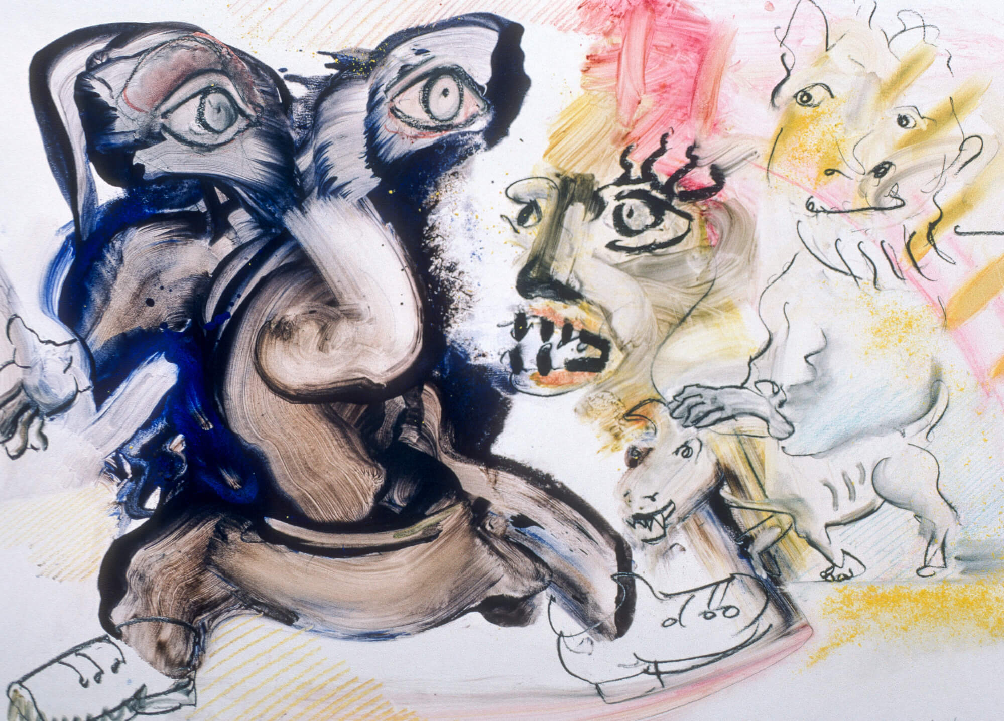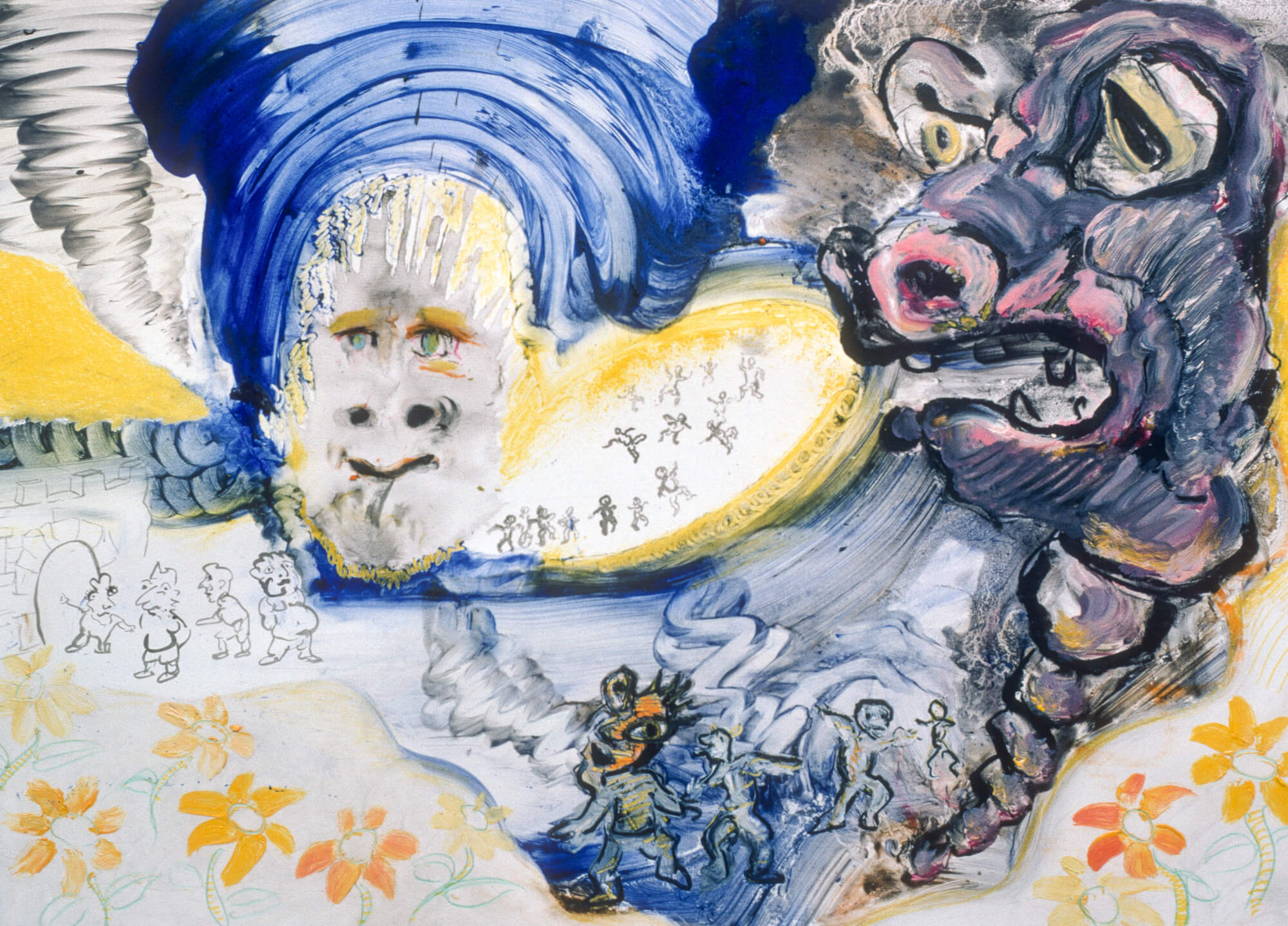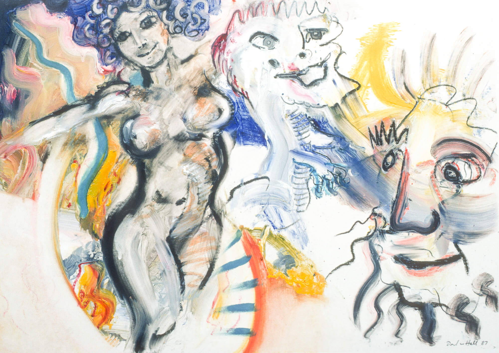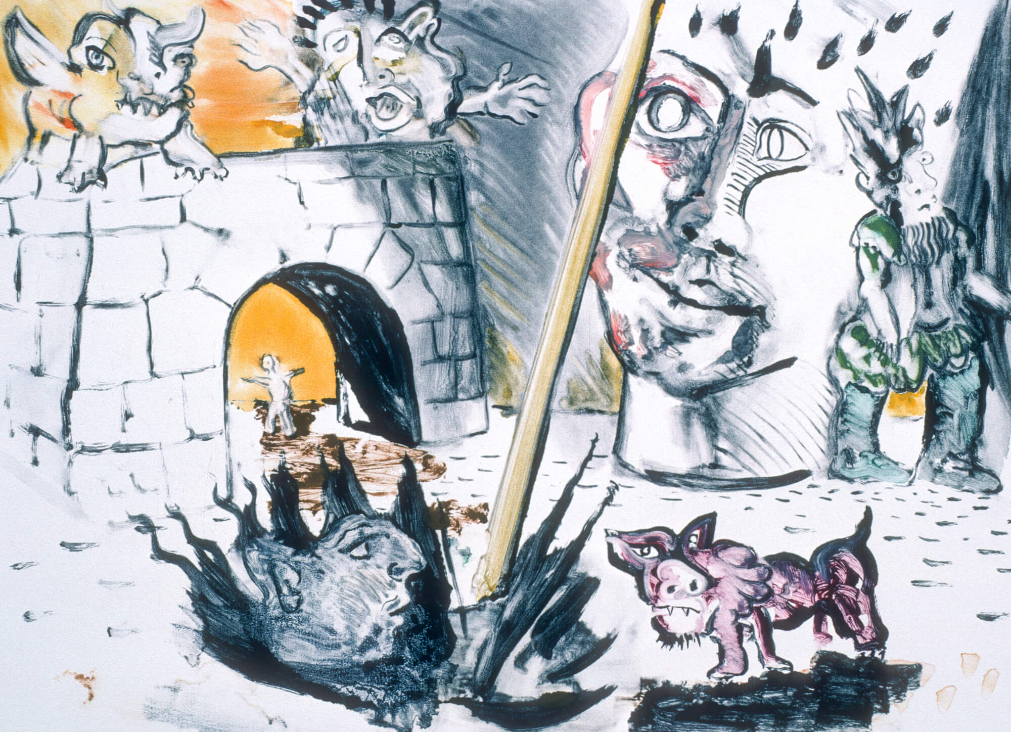 In late 1984 or early 1985, my husband David contracted Murine Thypus from the bite of a flea after he trapped a rat at his art studio. He was deathly ill and it took doctors a LONG time to figure out what he had. His fever burned at 104 for over 2 weeks. It was a very anxiety-inducing time. When he recovered and started to produce art again, I noticed the images literally burst forth from his brain and spilled onto the paper. Using the monotype medium, he could work very quickly, which suited the way his mind was working. So I called the group of work “Split Mind,” because it was as if his mind had split open! I don’t think David likes this category title very much, but that’s what I see. Humor, creatures, myths all mixed together with lots of energy.