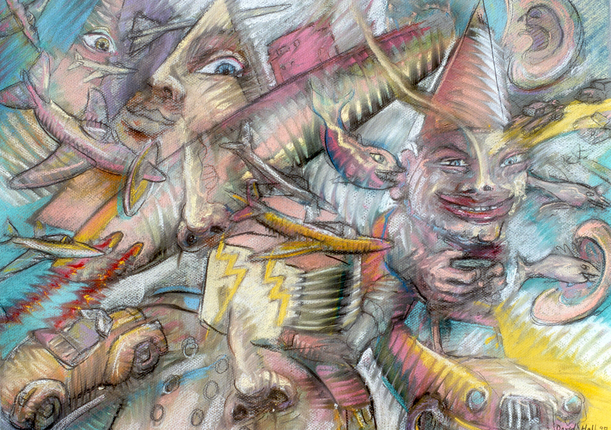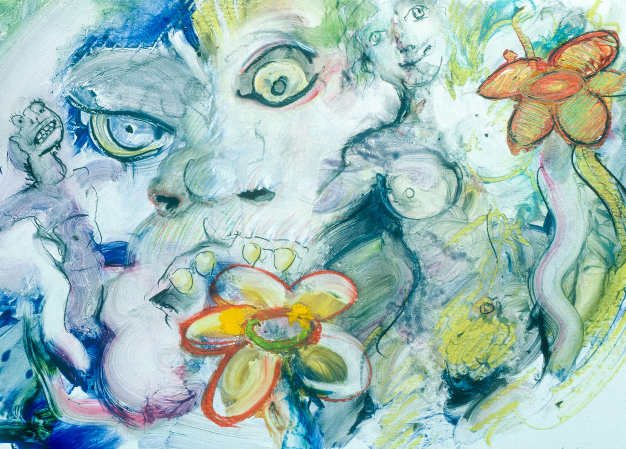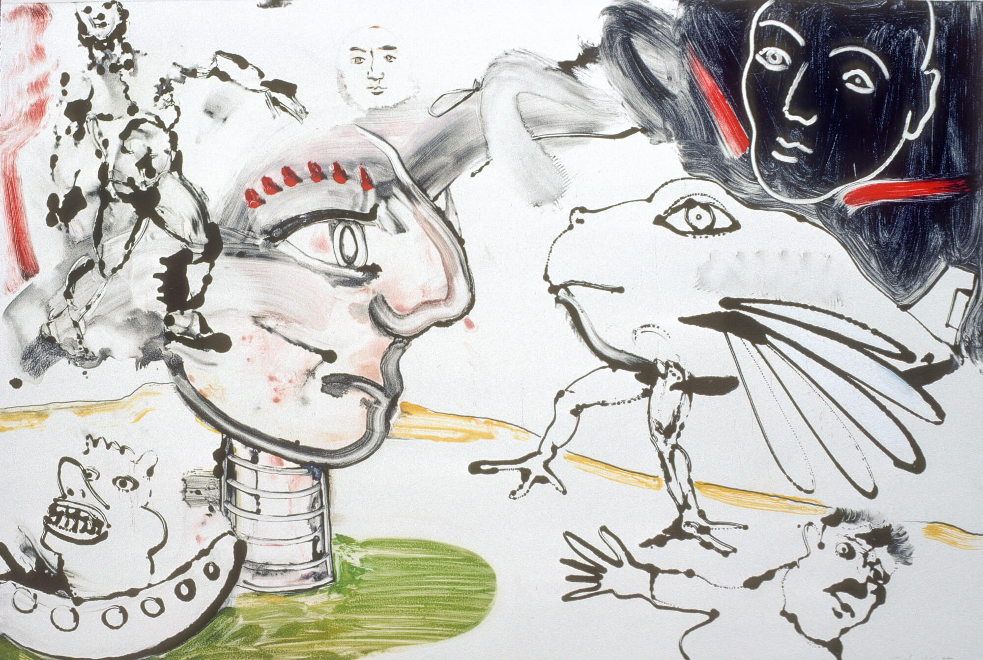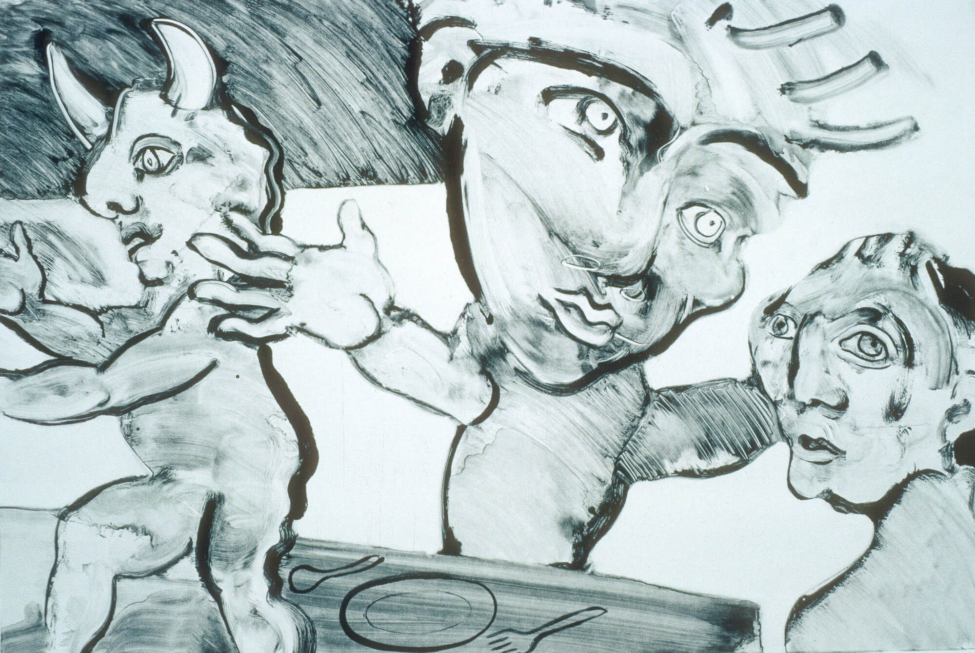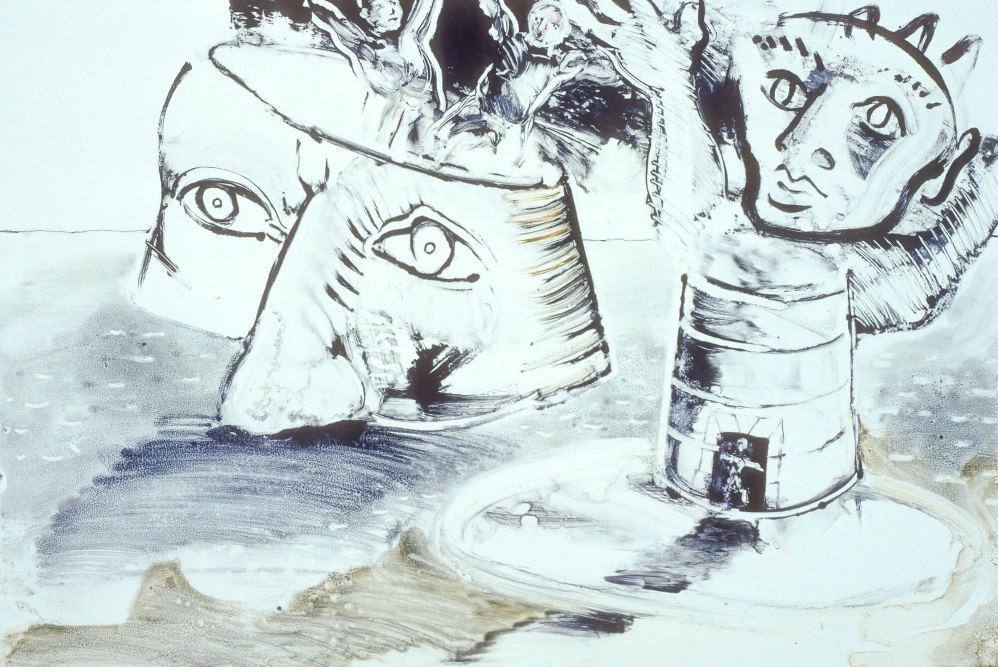 In late 1984 or early 1985, my husband David contracted Murine Thypus from the bite of a flea after he trapped a rat at his art studio. He was deathly ill and it took doctors a LONG time to figure out what he had. His fever burned at 104 for over 2 weeks. It was a very anxiety-inducing time. When he recovered and started to produce art again, I noticed the images literally burst forth from his brain and spilled onto the paper. Using the monotype medium, he could work very quickly, which suited the way his mind was working. So I called the group of work “Split Mind,” because it was as if his mind had split open! I don’t think David likes this category title very much, but that’s what I see. Humor, creatures, myths all mixed together with lots of energy.