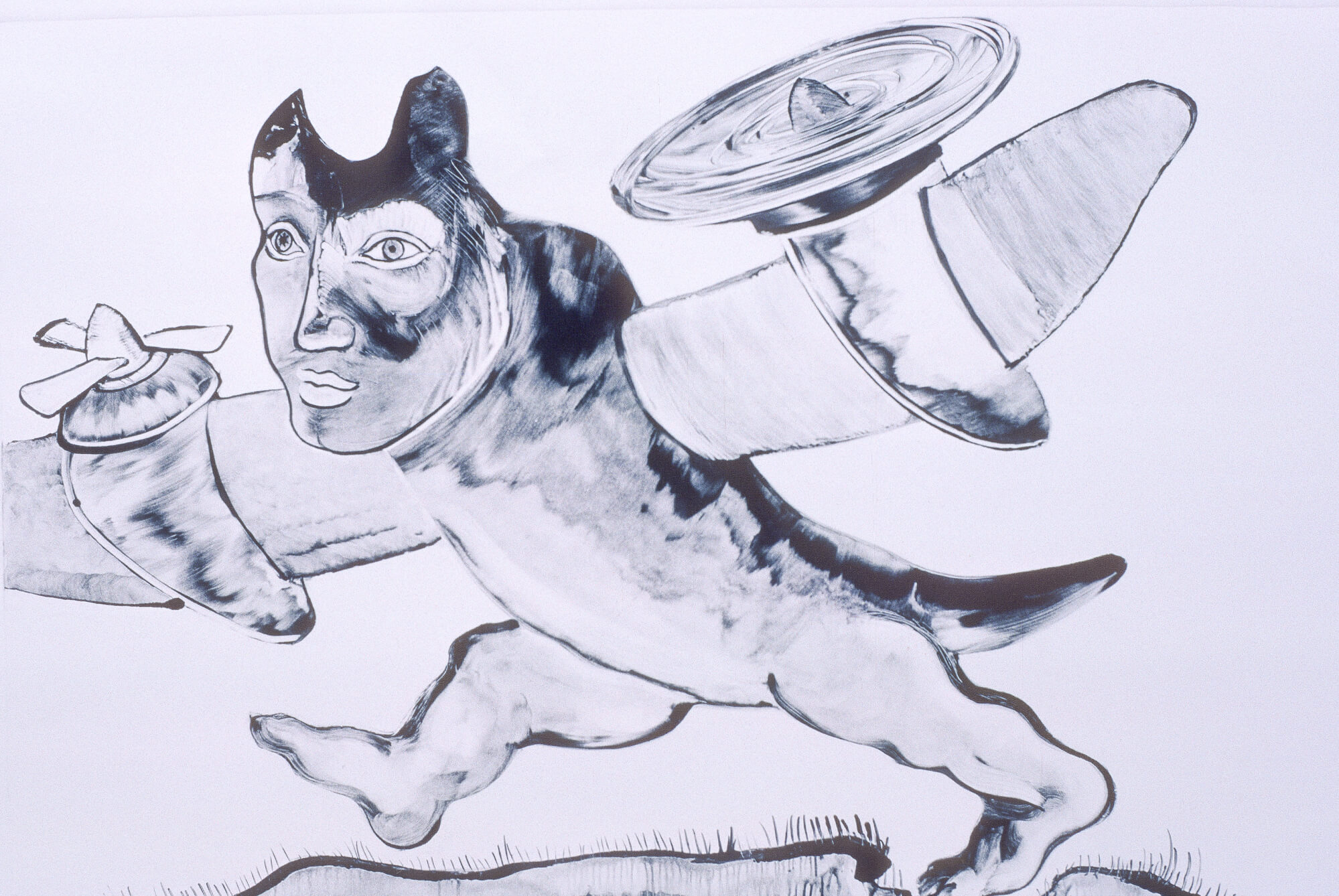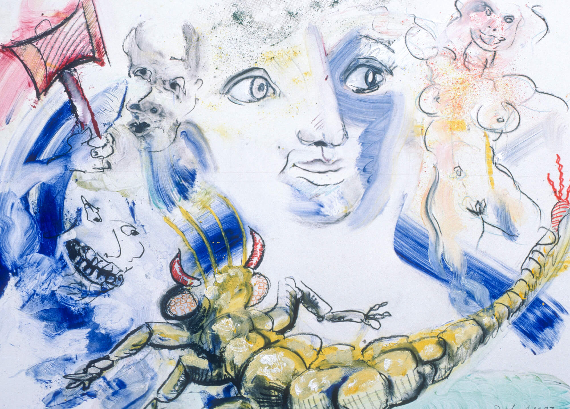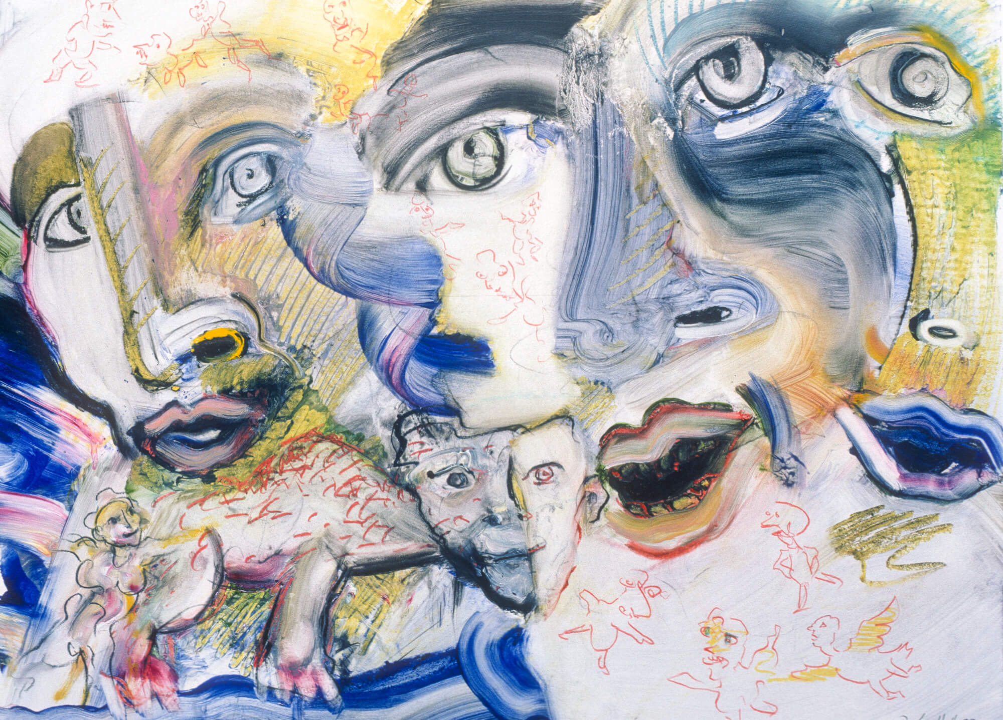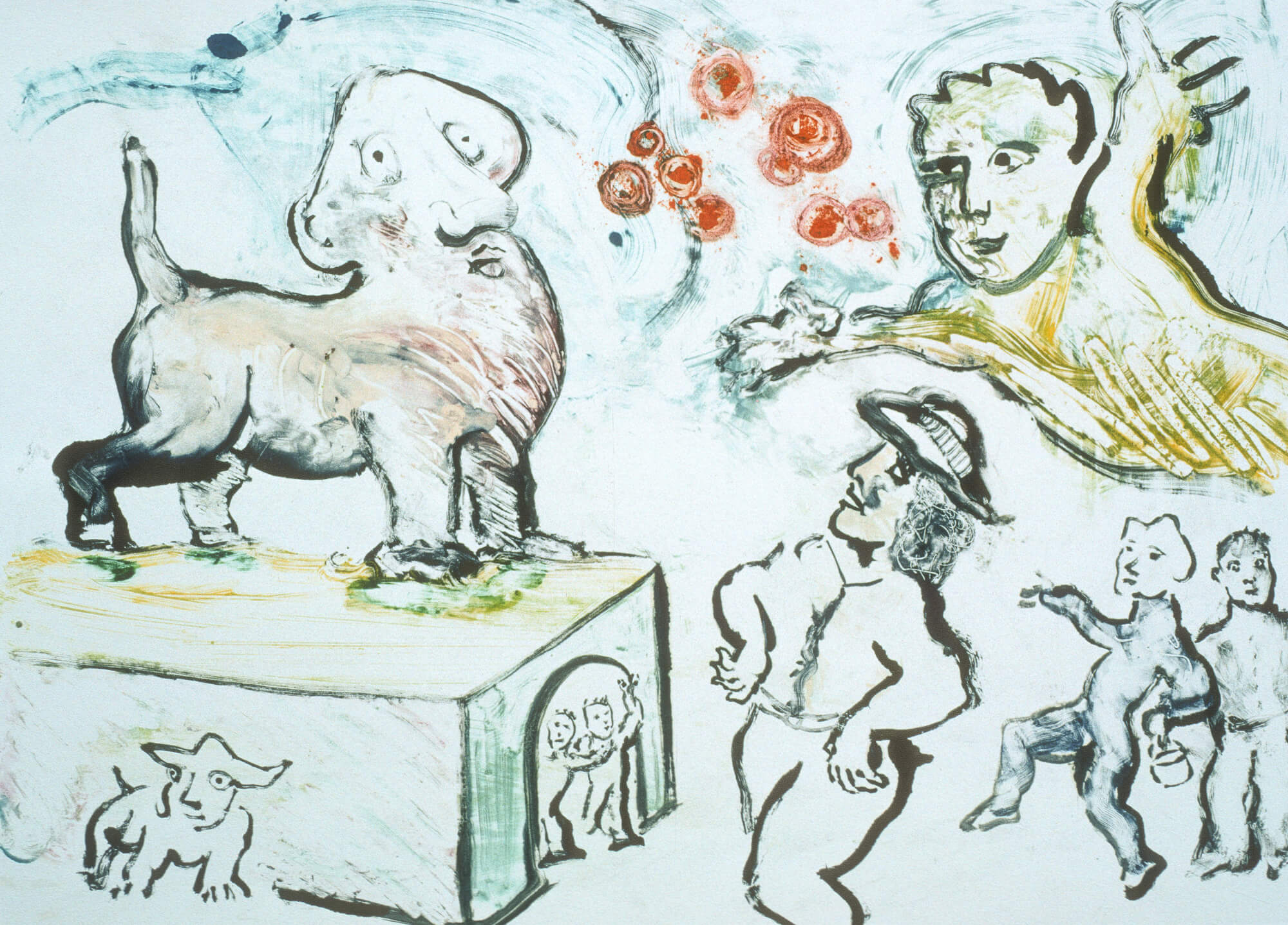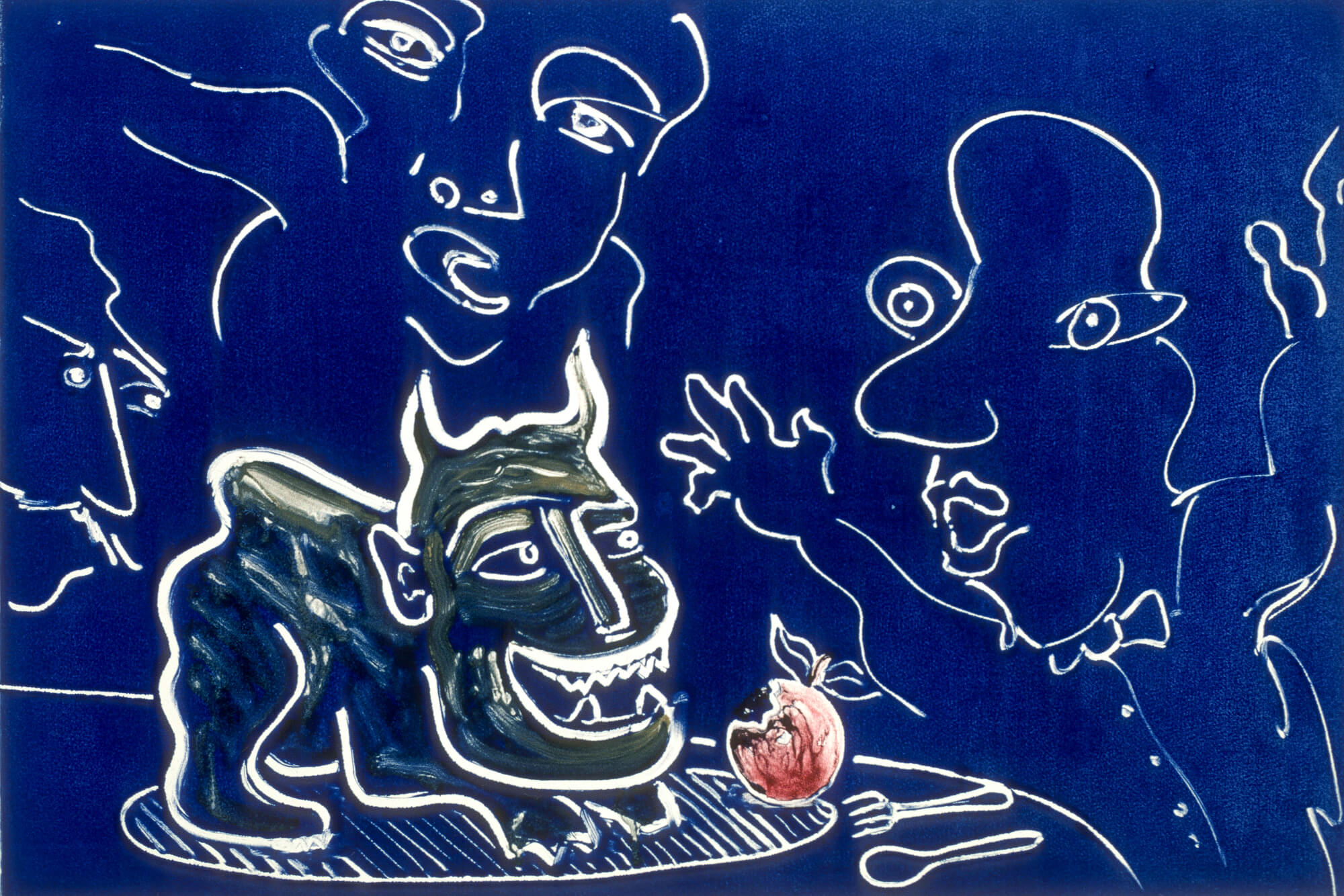 In late 1984 or early 1985, my husband David contracted Murine Thypus from the bite of a flea after he trapped a rat at his art studio. He was deathly ill and it took doctors a LONG time to figure out what he had. His fever burned at 104 for over 2 weeks. It was a very anxiety-inducing time. When he recovered and started to produce art again, I noticed the images literally burst forth from his brain and spilled onto the paper. Using the monotype medium, he could work very quickly, which suited the way his mind was working. So I called the group of work “Split Mind,” because it was as if his mind had split open! I don’t think David likes this category title very much, but that’s what I see. Humor, creatures, myths all mixed together with lots of energy.