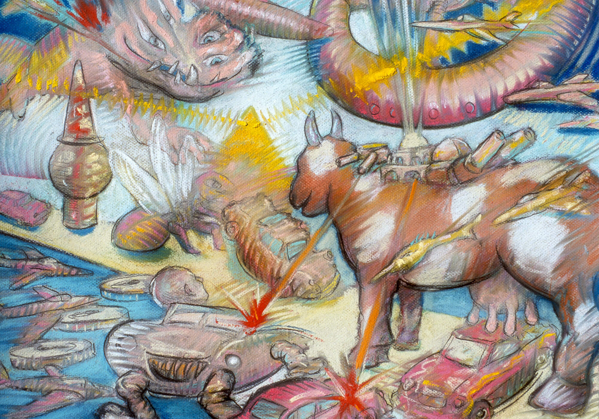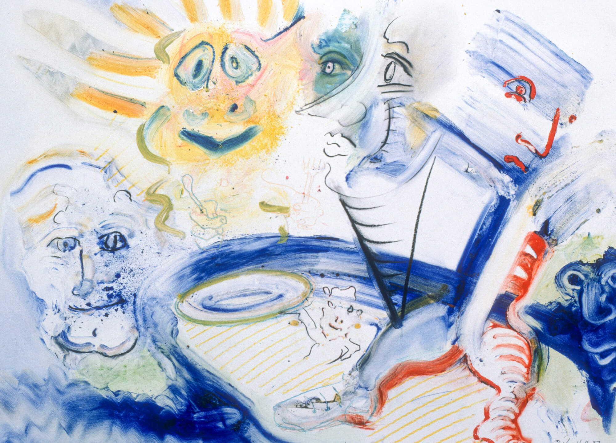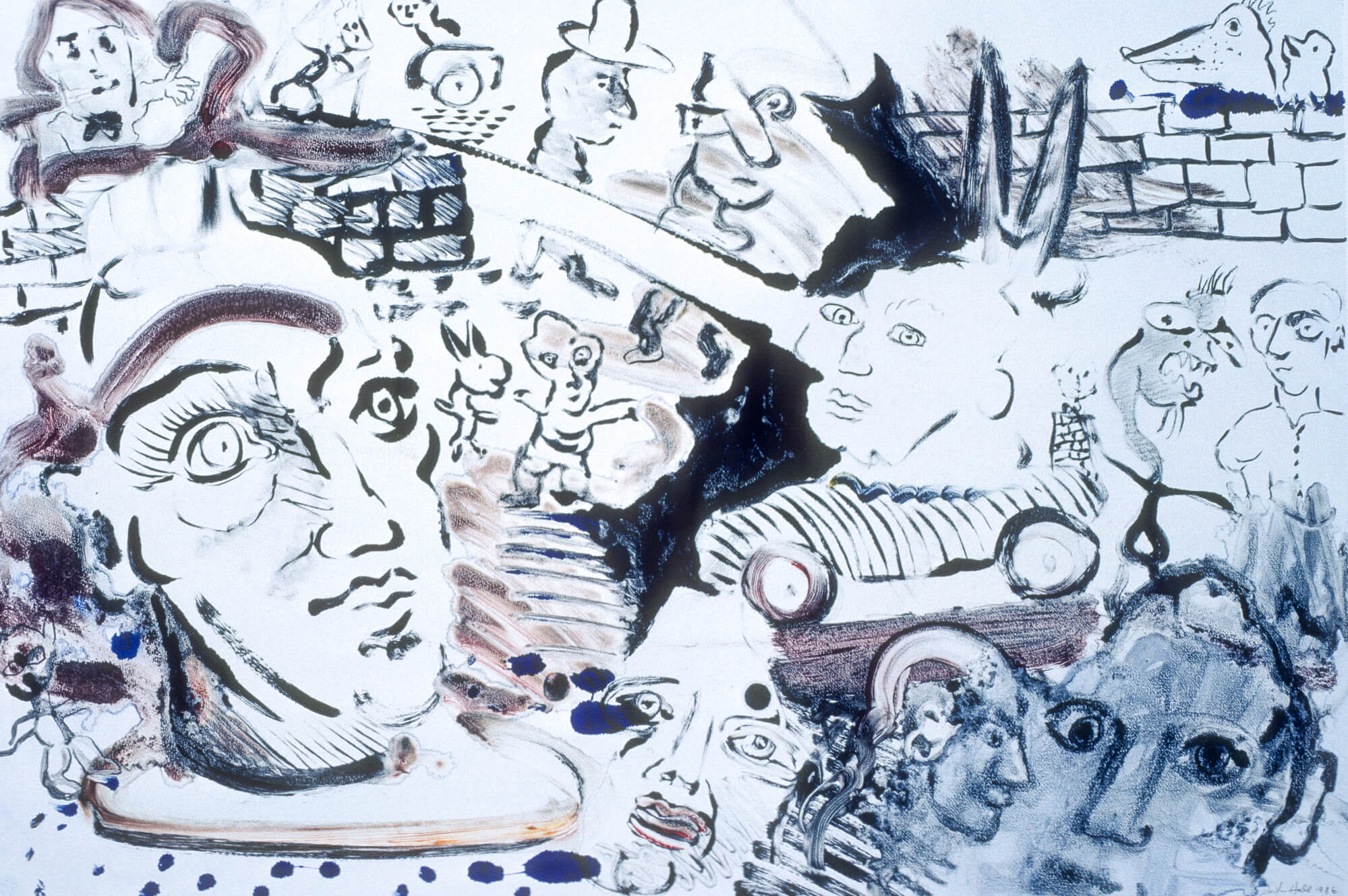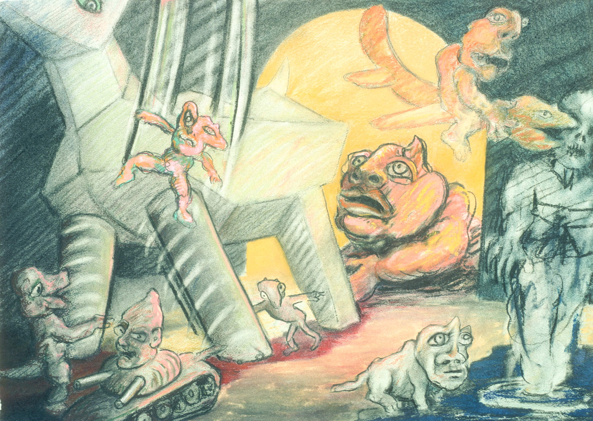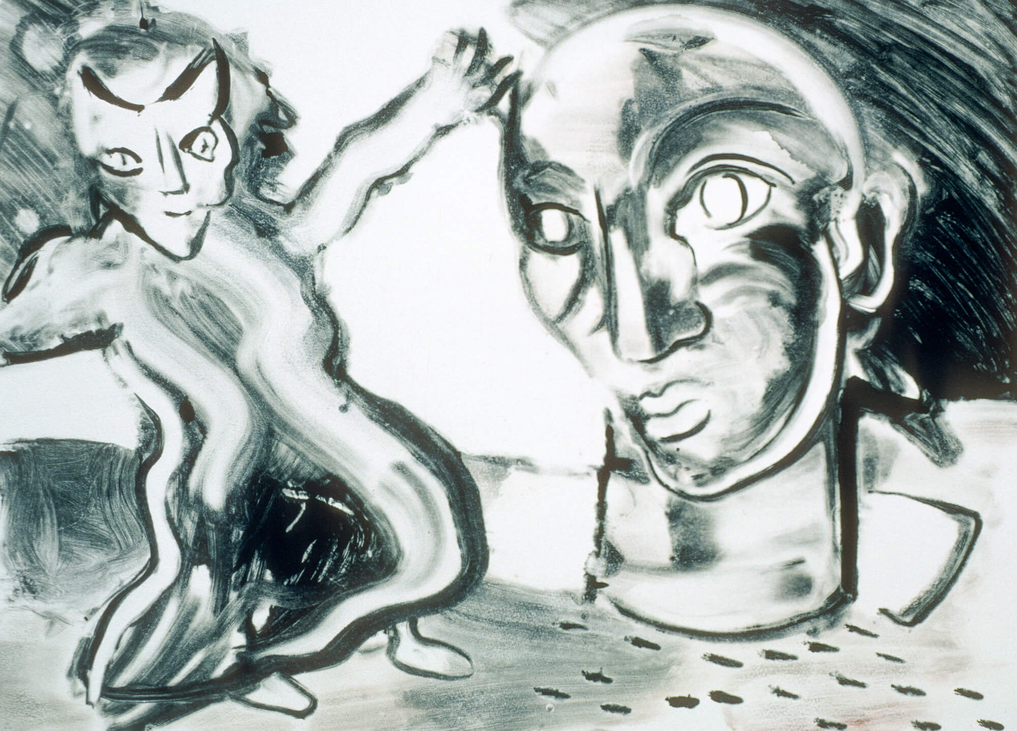 In late 1984 or early 1985, my husband David contracted Murine Thypus from the bite of a flea after he trapped a rat at his art studio. He was deathly ill and it took doctors a LONG time to figure out what he had. His fever burned at 104 for over 2 weeks. It was a very anxiety-inducing time. When he recovered and started to produce art again, I noticed the images literally burst forth from his brain and spilled onto the paper. Using the monotype medium, he could work very quickly, which suited the way his mind was working. So I called the group of work “Split Mind,” because it was as if his mind had split open! I don’t think David likes this category title very much, but that’s what I see. Humor, creatures, myths all mixed together with lots of energy.